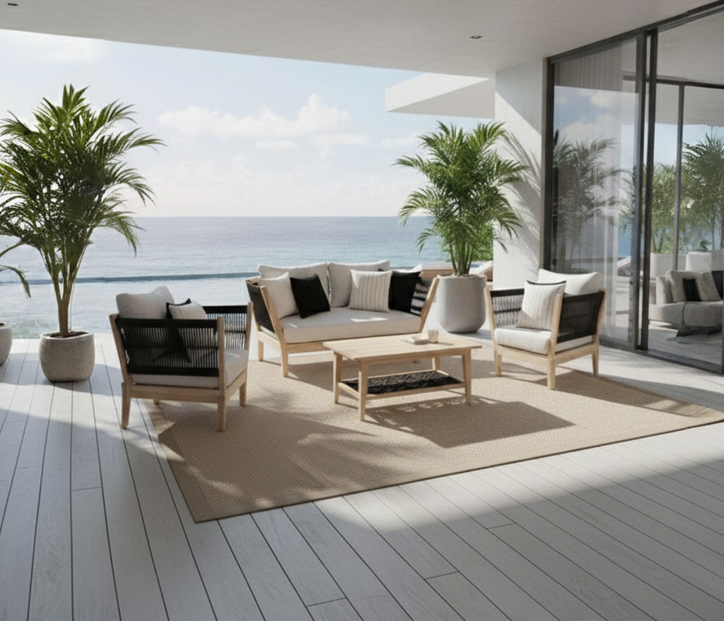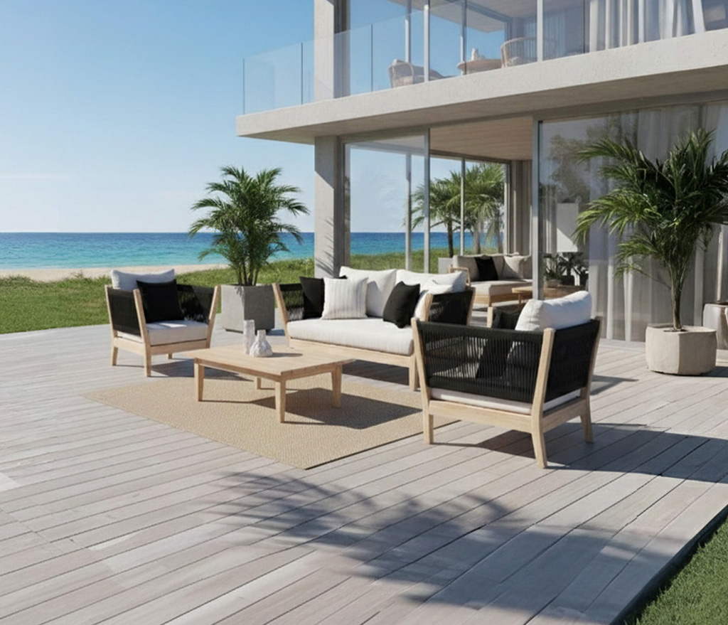 Materiales: Sala con estructura de madera, cojinería fabricada con hule espuma de alta densidad y tela resistente al sol y la intemperie.