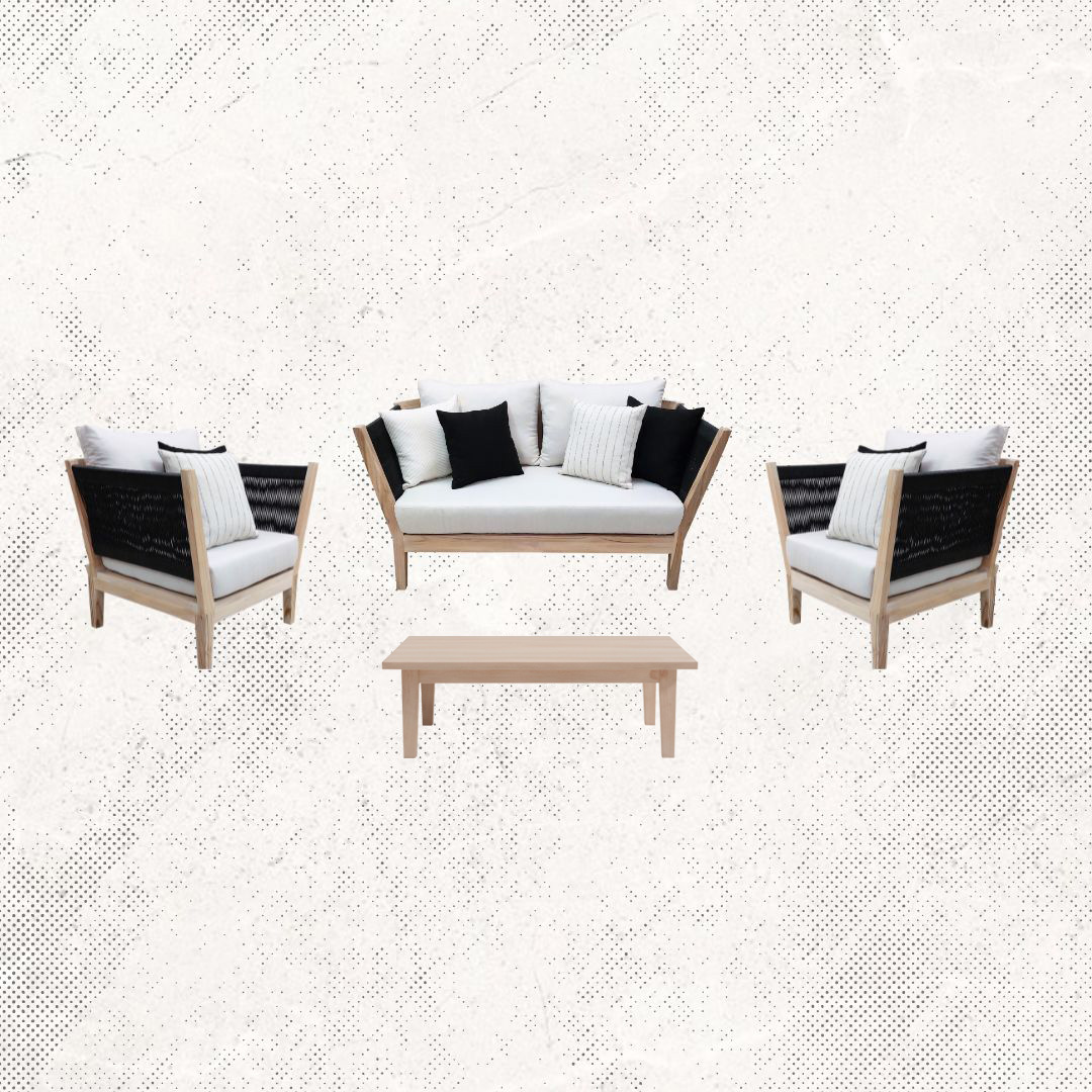 Materiales: Sala con estructura de madera, tejida con rejilla sintética de alta calidad, cojinería fabricada con hule espuma de alta densidad y tela resistente al sol y la intemperie.