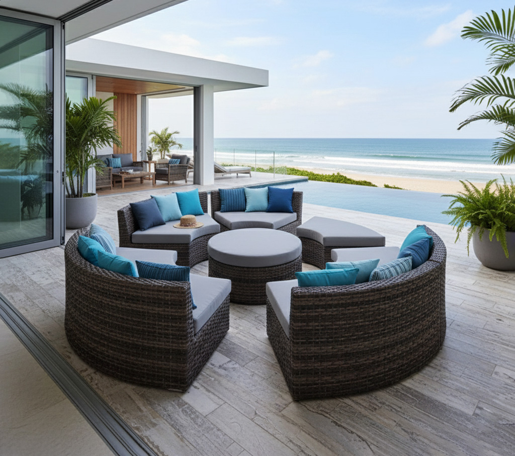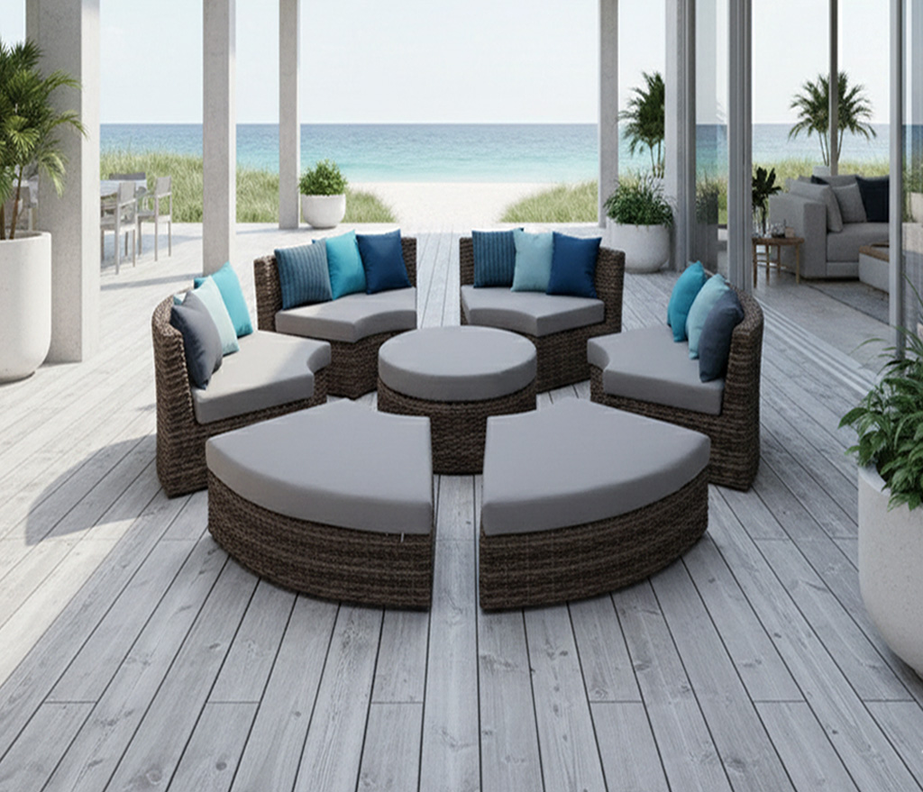 Armazón de aluminio, tejido con rejilla sintética, cojines en tela sumbrella, hule espuma de alta densidad.
