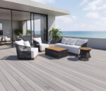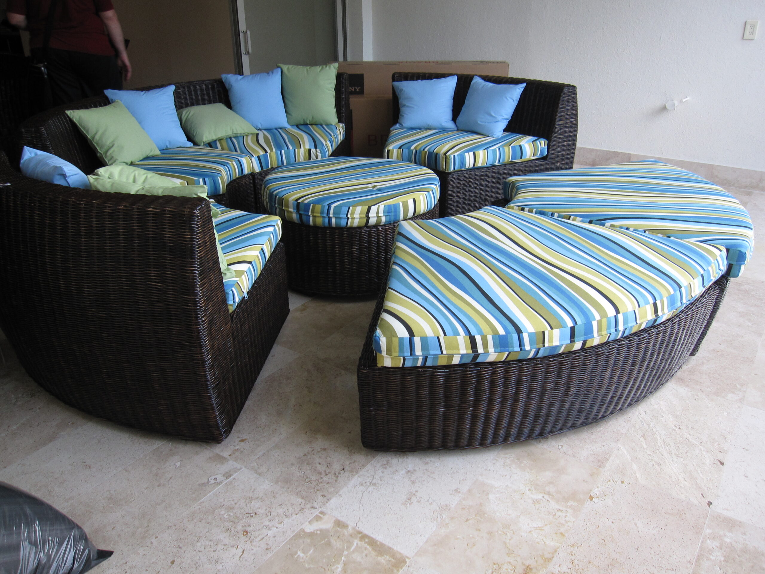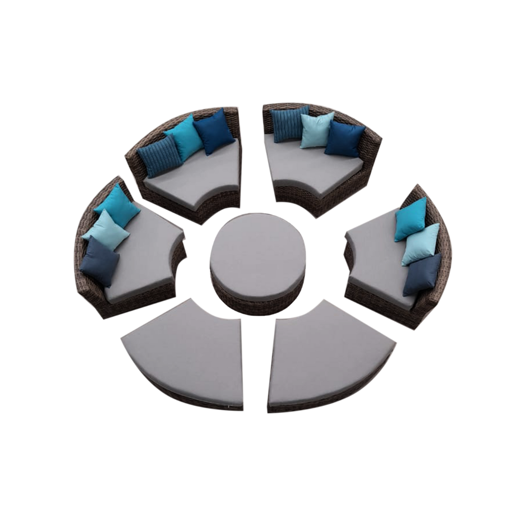 Materiales: Sala con estructura de aluminio, tejida con rejilla sintética de alta calidad, cojinería fabricada con hule espuma de alta densidad y tela resistente al sol y la intemperie.