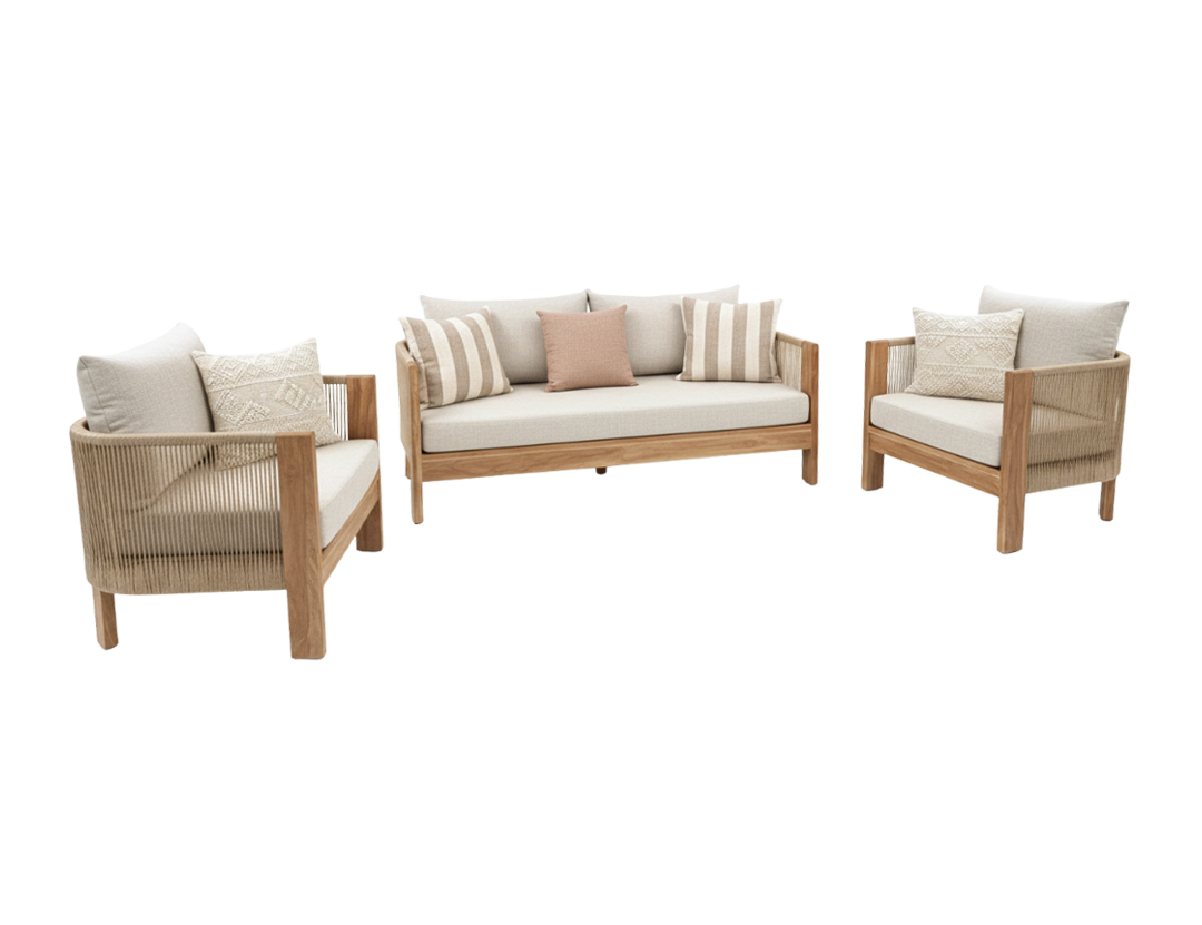 Materiales: Sala con estructura de aluminio, tejida con rejilla sintética de alta calidad, cojinería fabricada con hule espuma de alta densidad y tela resistente al sol y la intemperie.