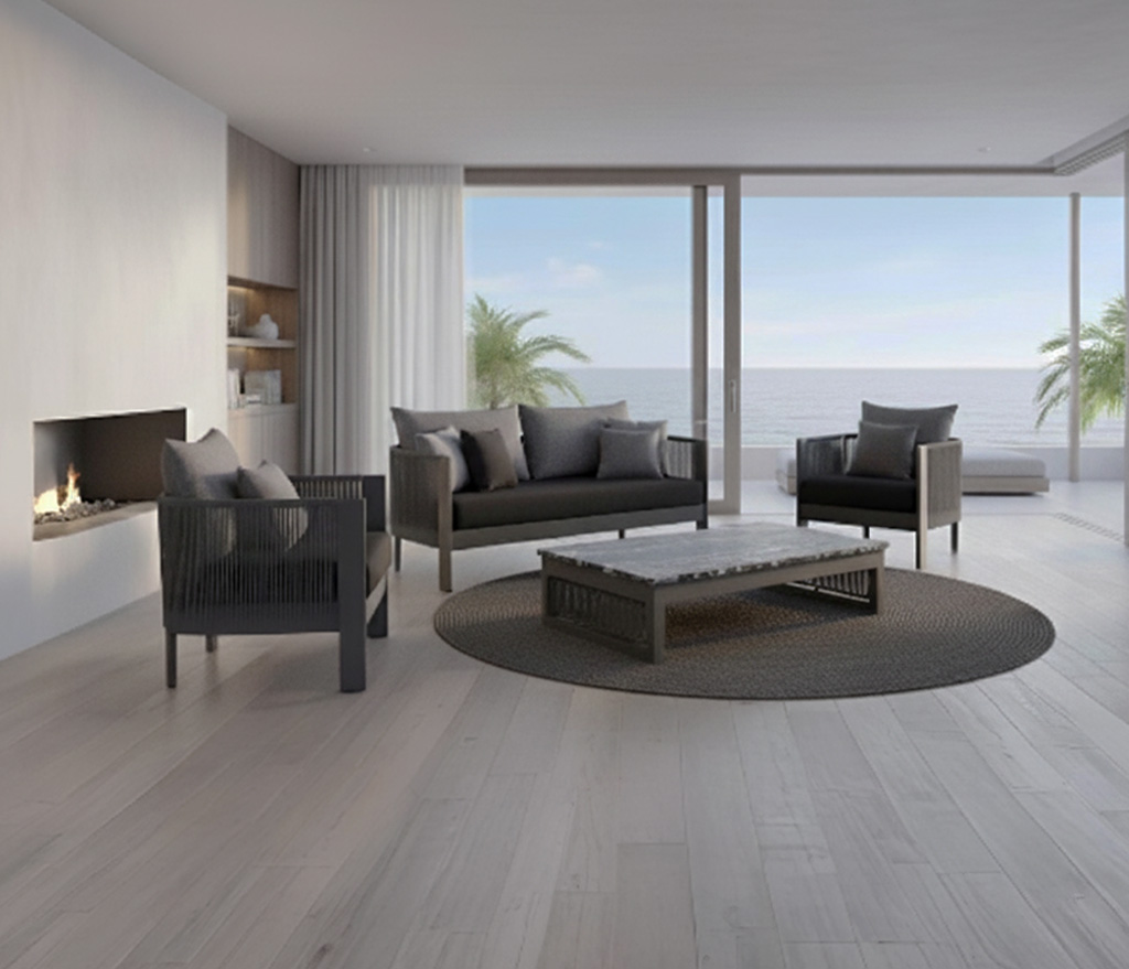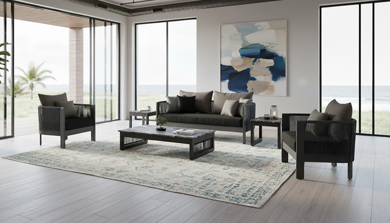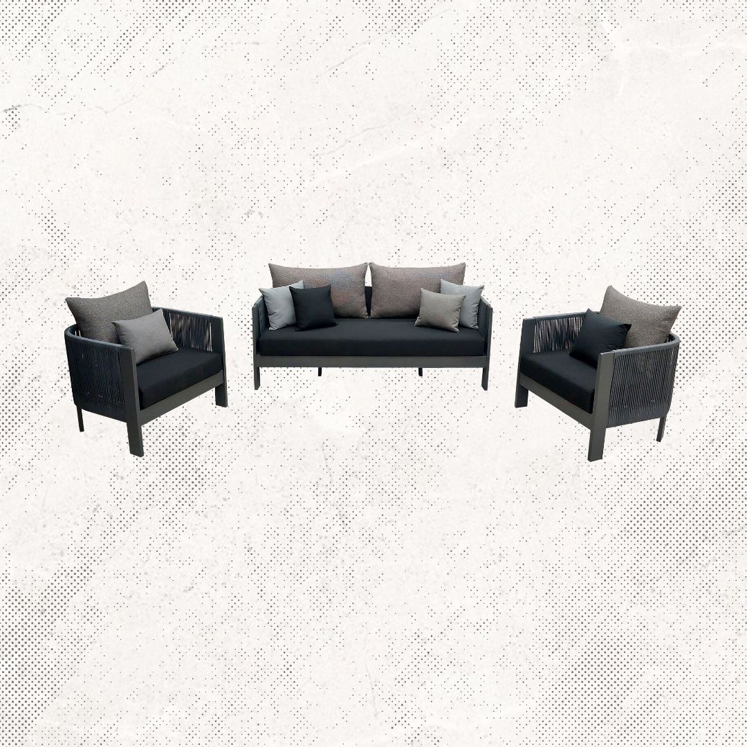 Materiales: Sala con estructura de aluminio, tejida con rejilla sintética de alta calidad, cojinería fabricada con hule espuma de alta densidad y tela resistente al sol y la intemperie.