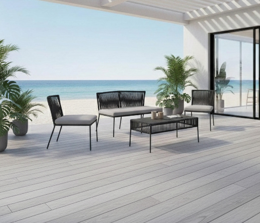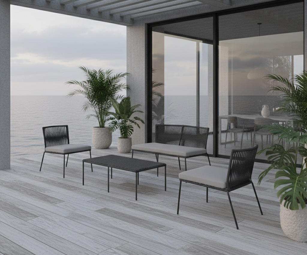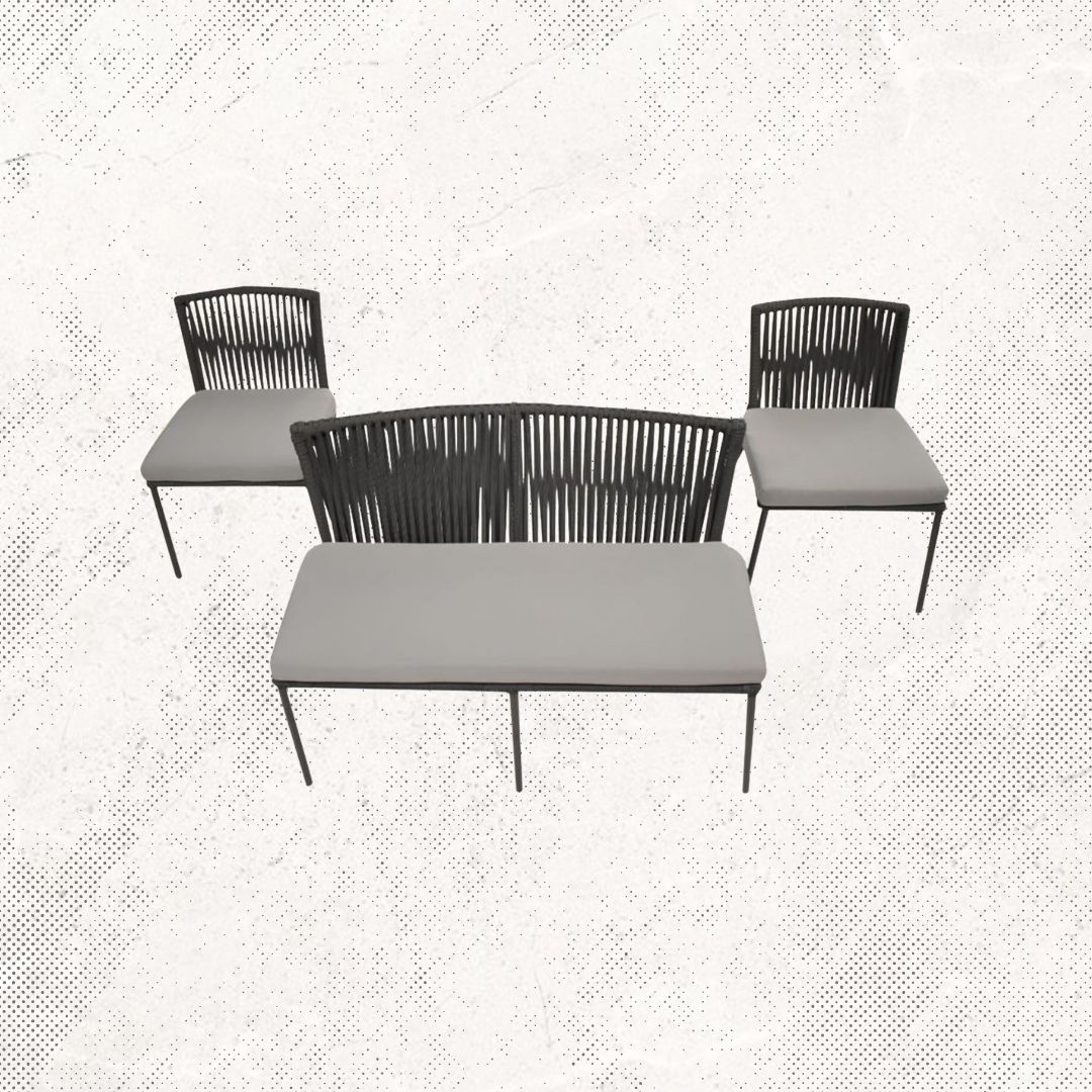 Materiales: Sala con estructura de aluminio, tejida con rejilla sintética de alta calidad, cojinería fabricada con hule espuma de alta densidad y tela resistente al sol y la intemperie.