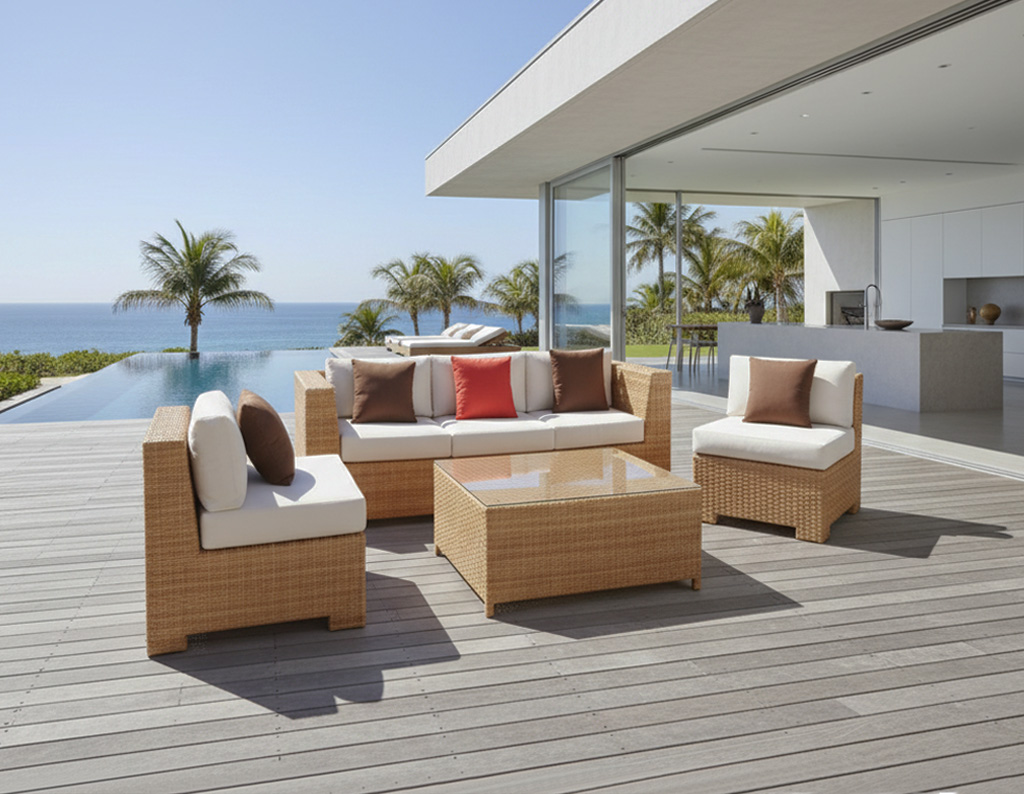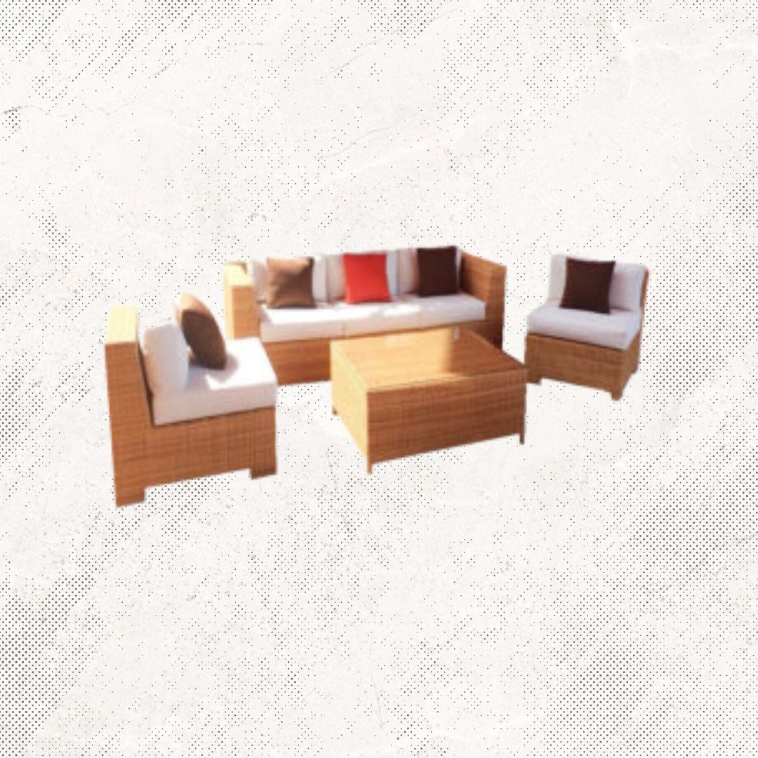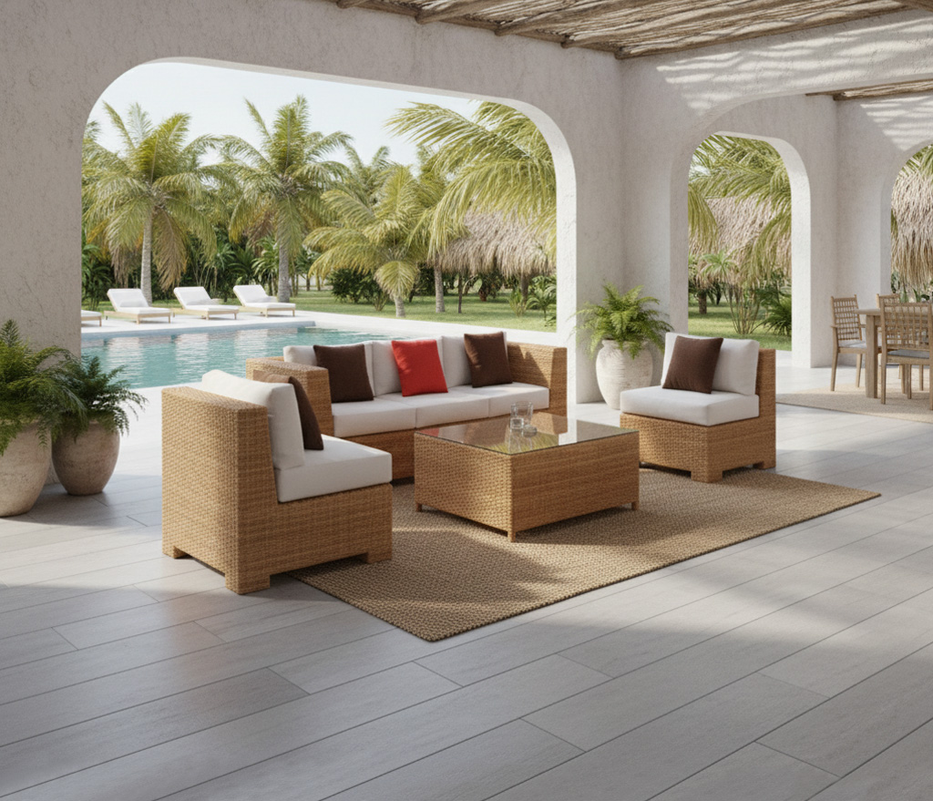 Materiales: Sala con estructura de madera, cojinería fabricada con hule espuma de alta densidad y tela resistente al sol y la intemperie.