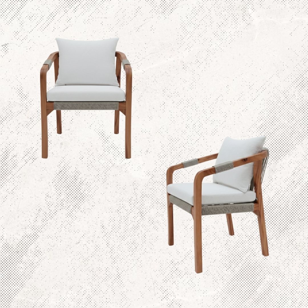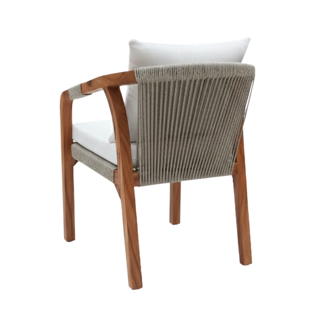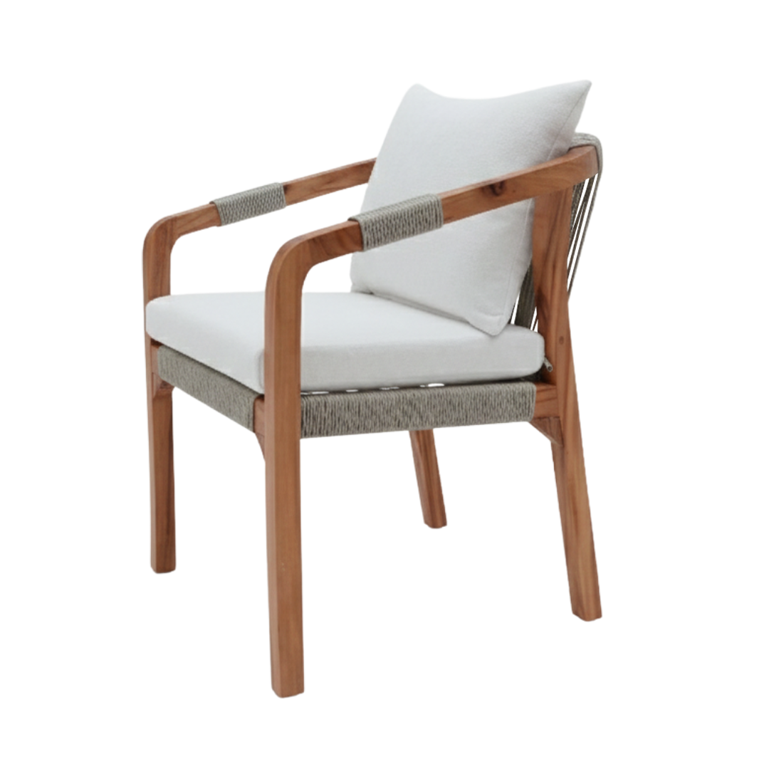Estructura en madera y aluminio, tejido con rejilla sintética, cojineria fabricada con hule espuma de alta densidad y tela resistente al sol y la intemperie.