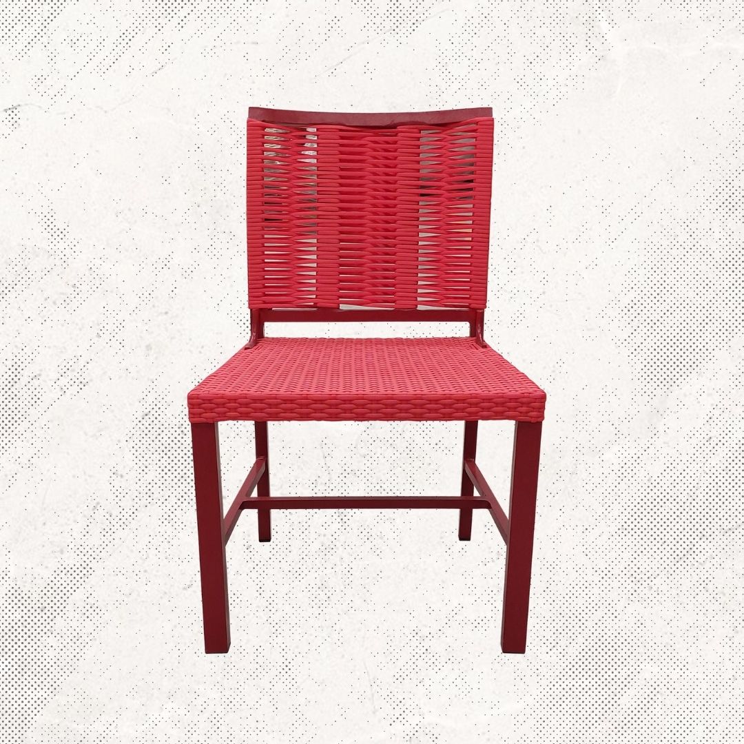 Materiales: Silla con estructura de aluminio tejida con rejilla sintética de alta calidad, cojinería fabricada con hule espuma de alta densidad y tela resistente al sol y la intemperie.