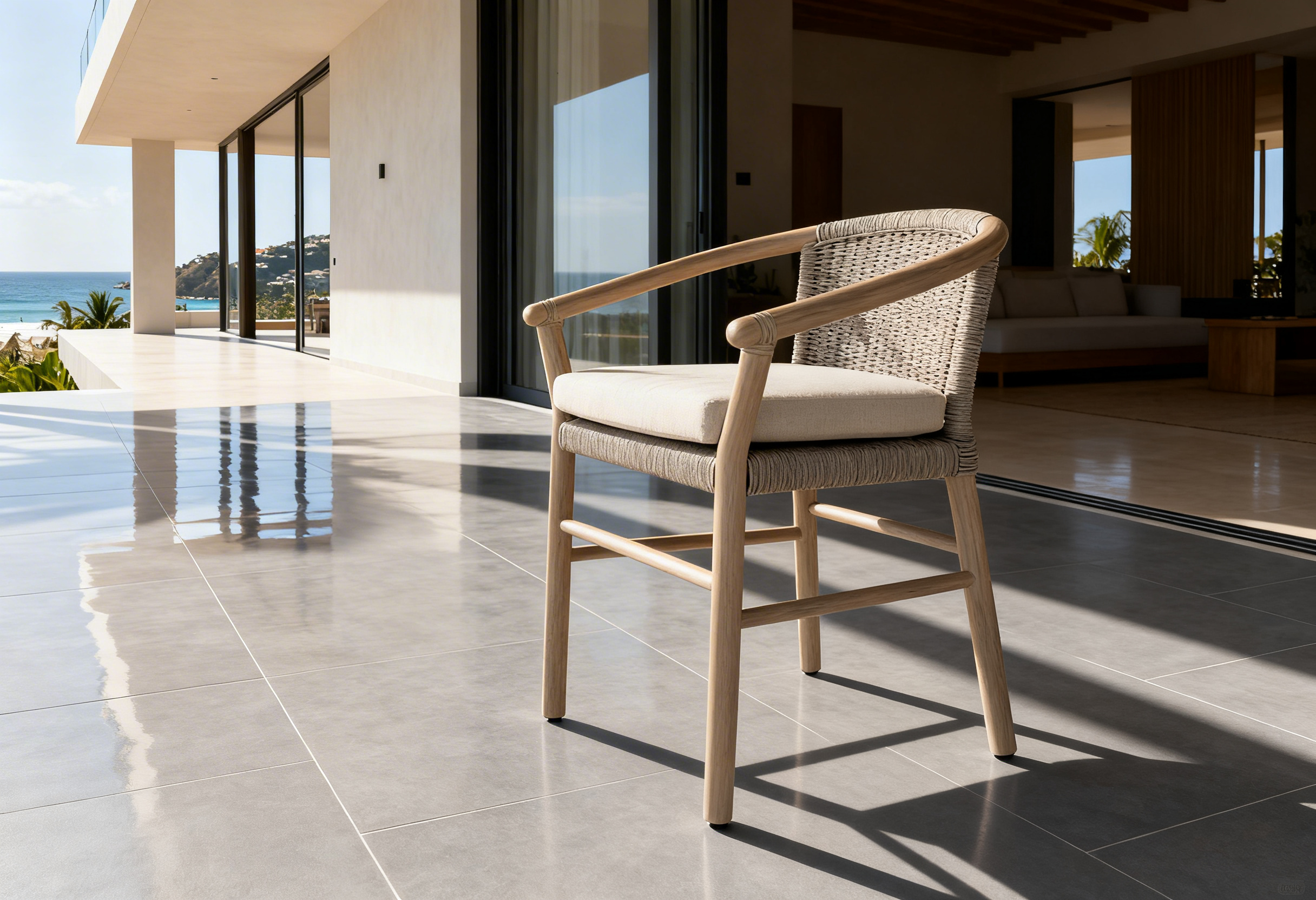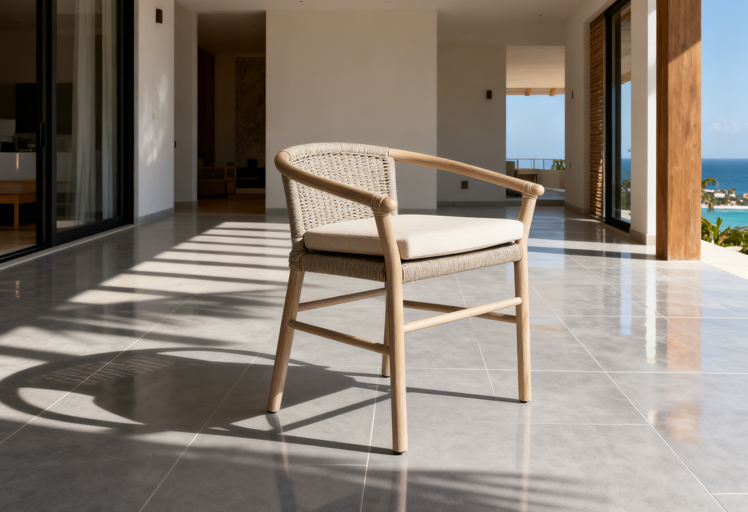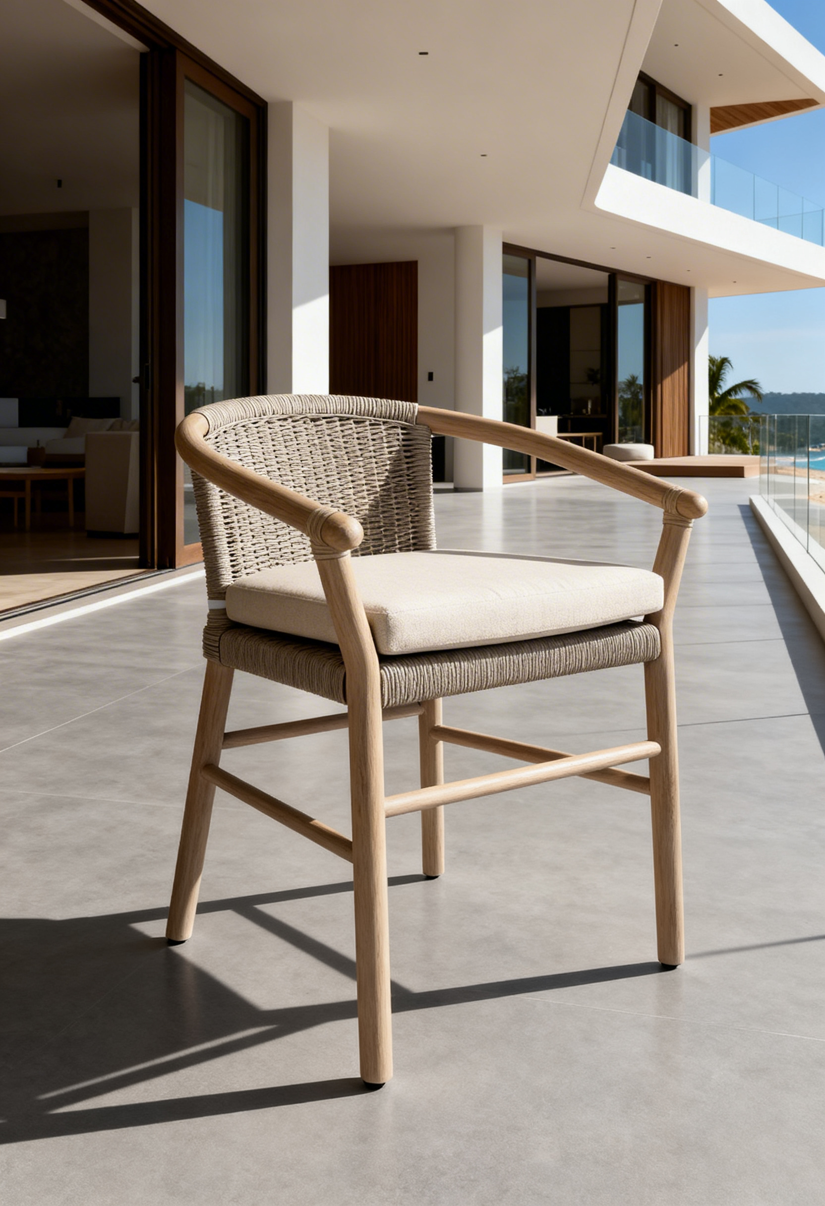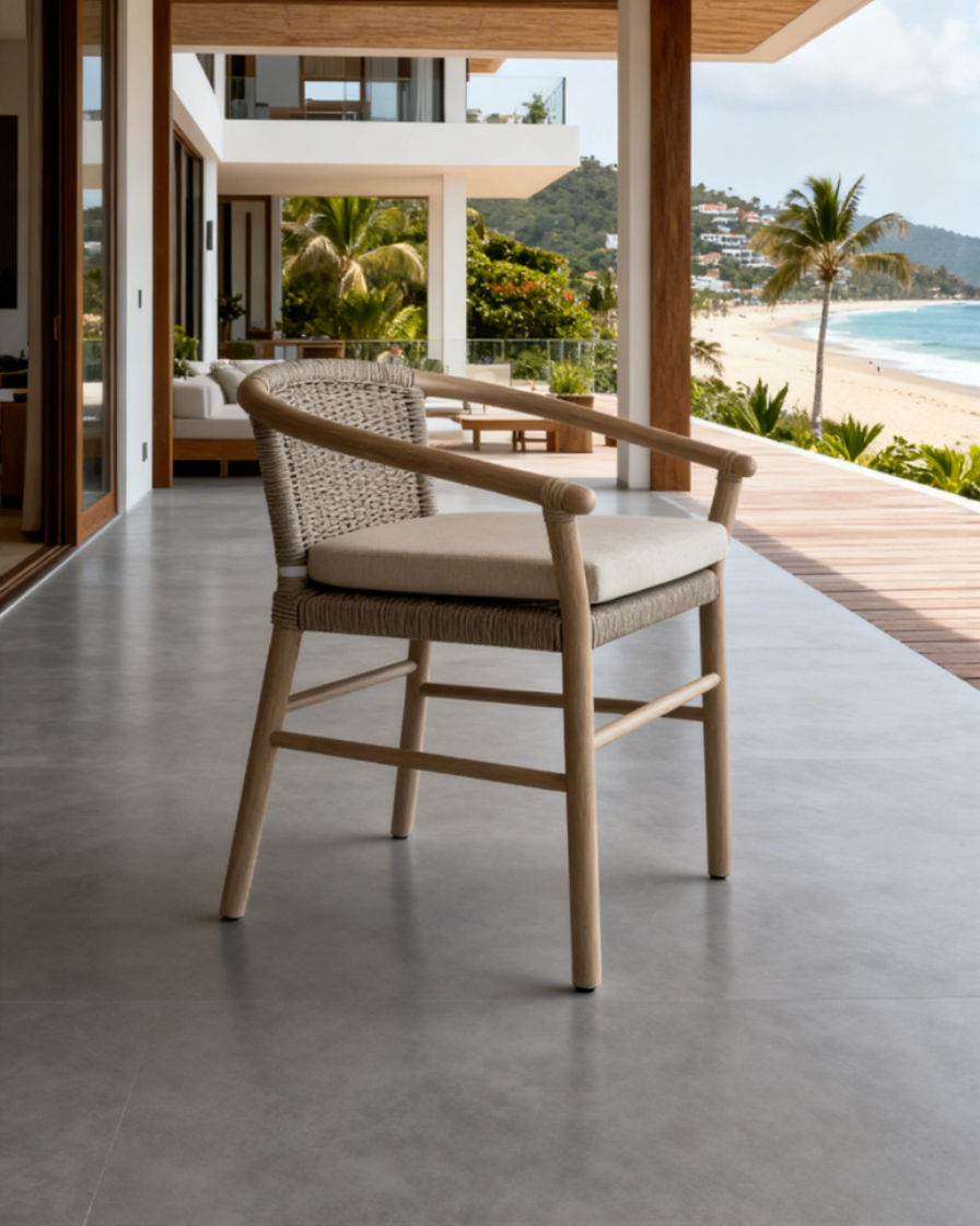 Materiales: Estructura de madera Rosa Morada con acabado semi-mate, respaldo y asiento tejido con rejilla sintética de alta calidad, cojinería de asiento con espuma de alta densidad, funda doble, cierre reforzado y tela de tapicería a elección o personalizable.