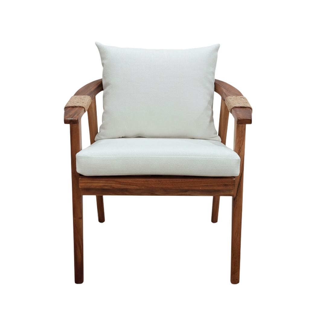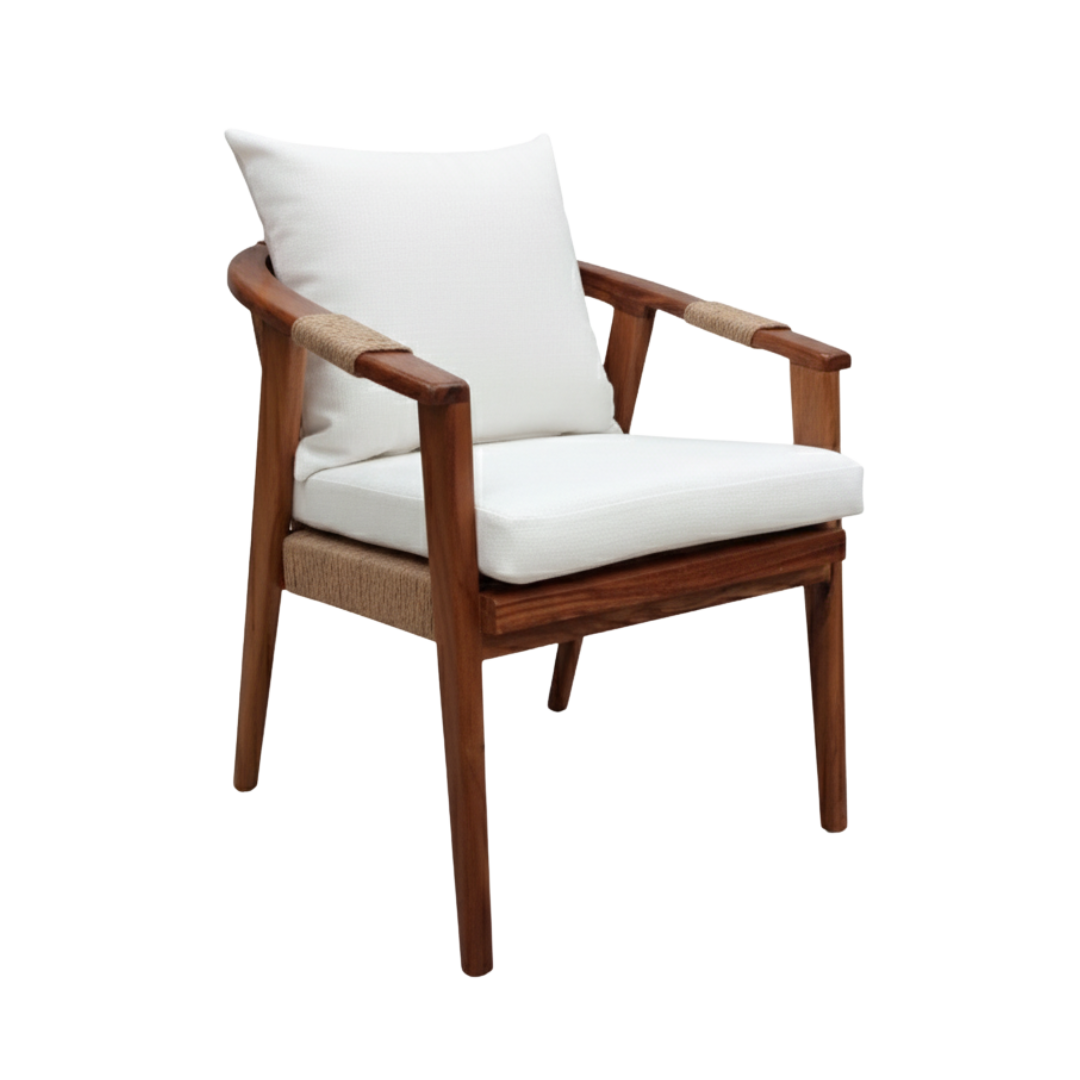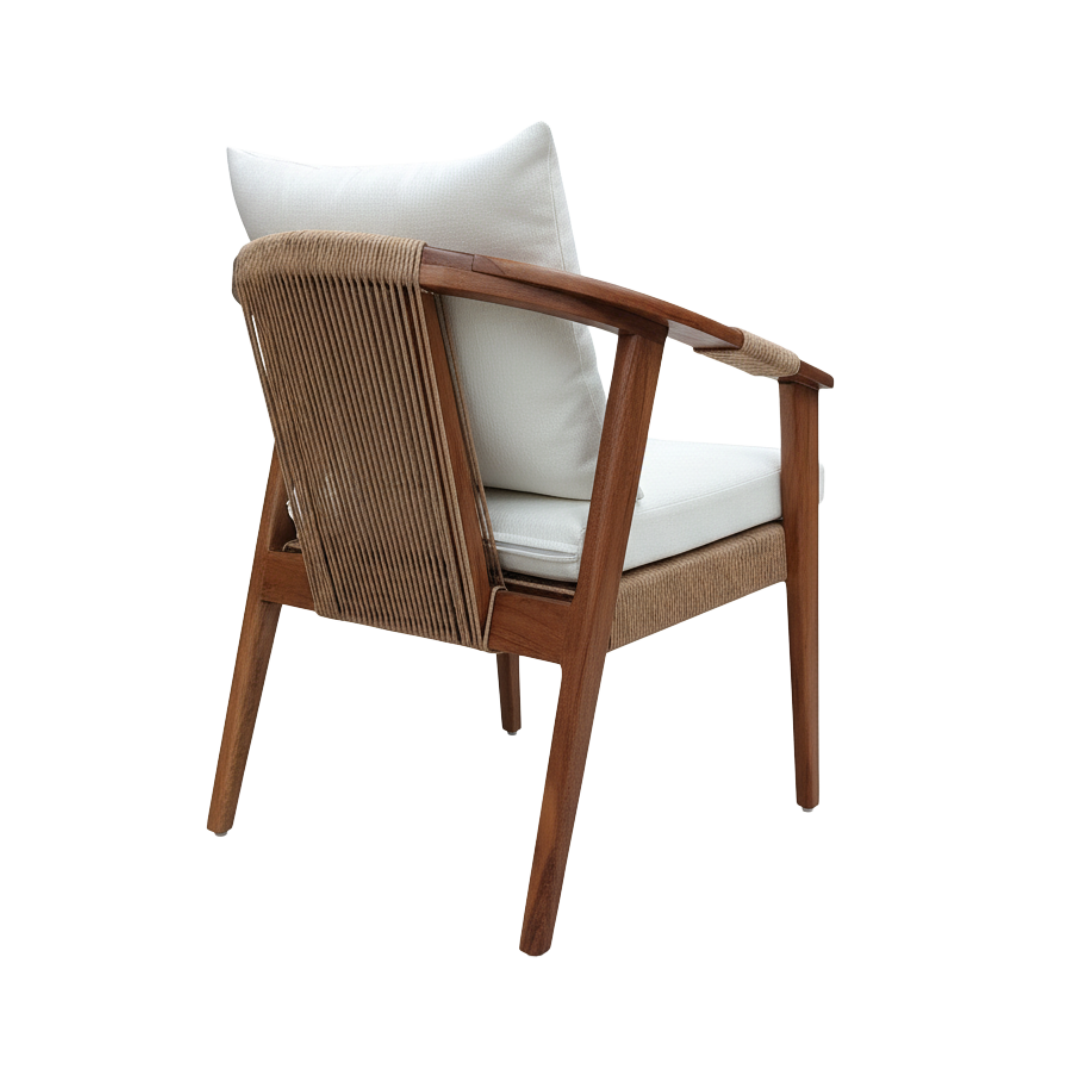 Materiales: Silla con estructura de aluminio tejida con rejilla sintética de alta calidad, cojinería fabricada con hule espuma de alta densidad y tela resistente al sol y la intemperie.