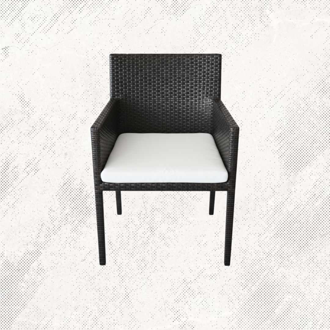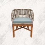 Estructura en madera y aluminio, tejido con rejilla sintética, cojineria fabricada con hule espuma de alta densidad y tela resistente al sol y la intemperie.