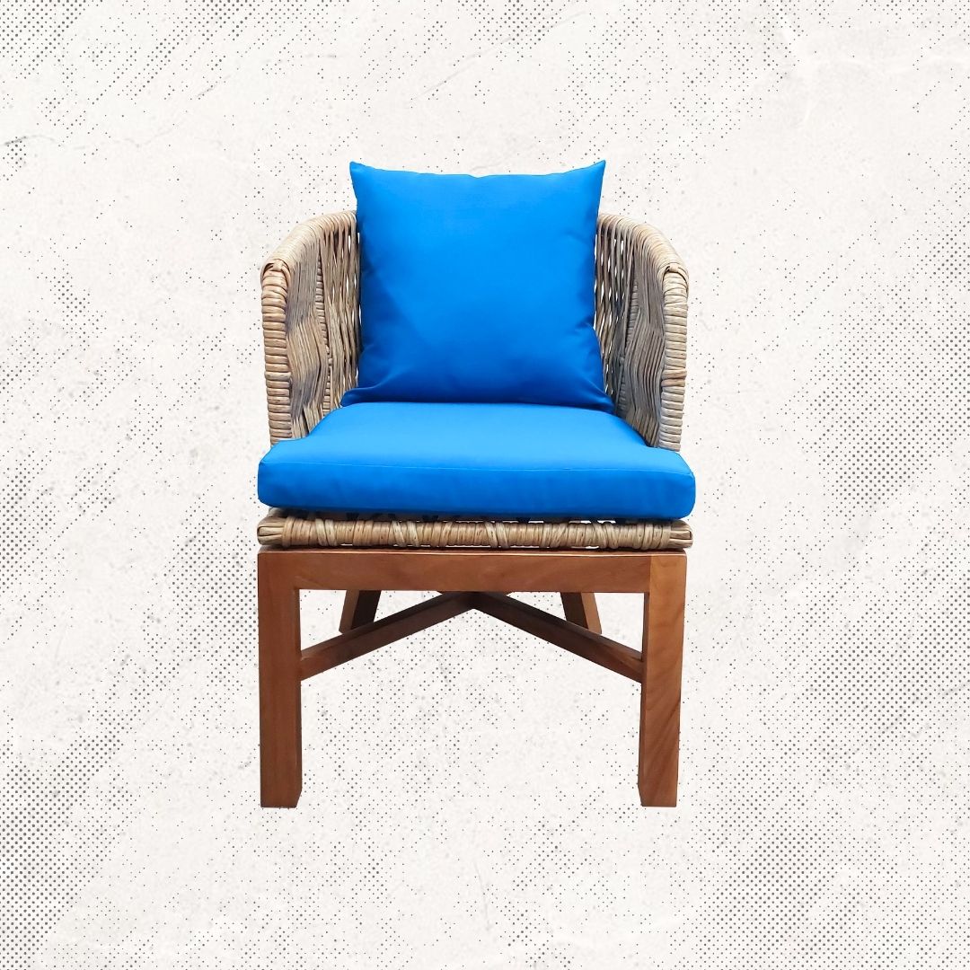 Mesa redonda con cubierta de madera y 4 sillas modelo Victoria, tejidas con rattan sintético, madera de parota, cojines en tela Sumbrella