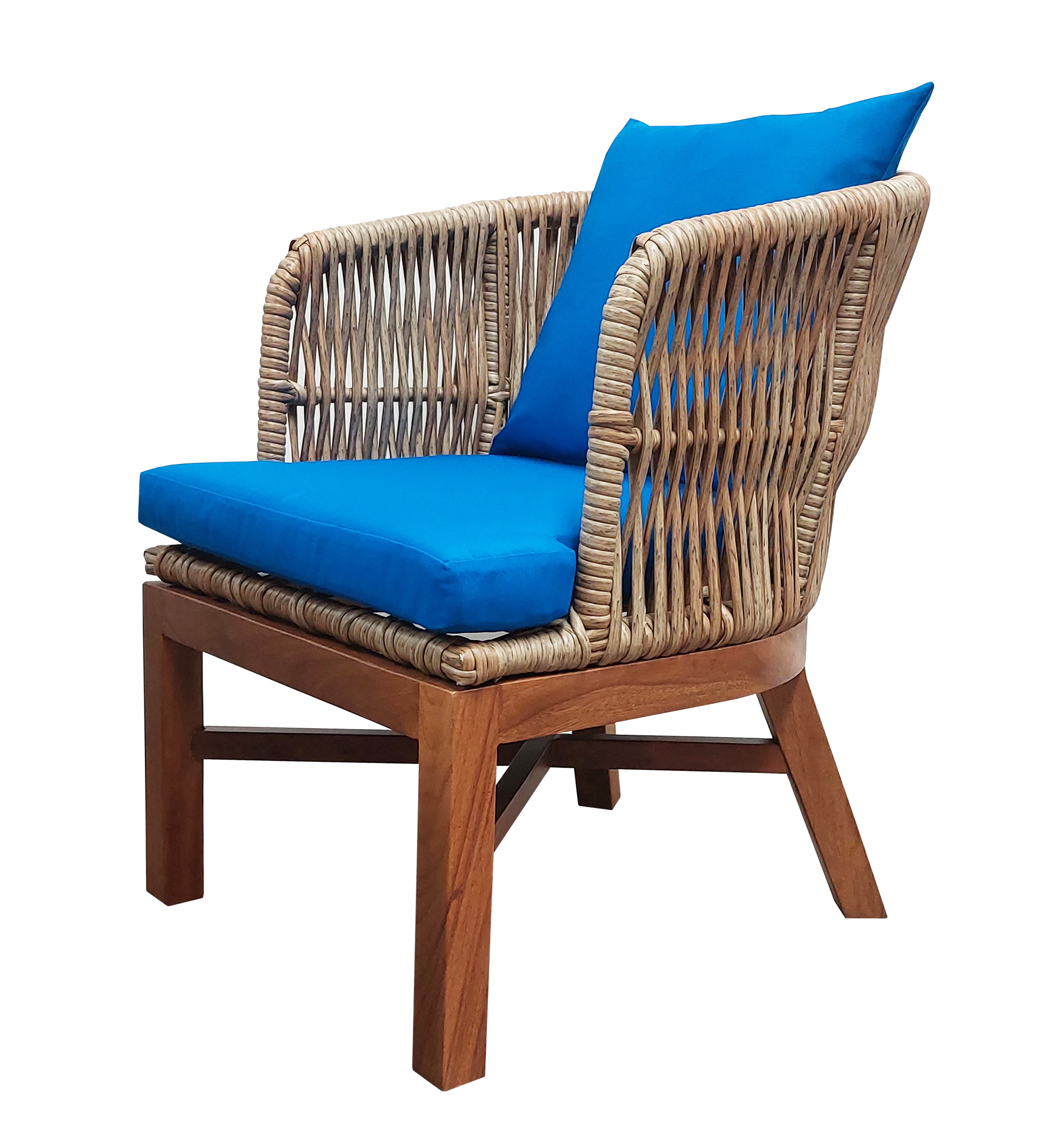 Estructura de aluminio tejida con rattan sintético, cojineria fabricada con hule espuma de alta densidad y tela resistente al sol y la intemperie.