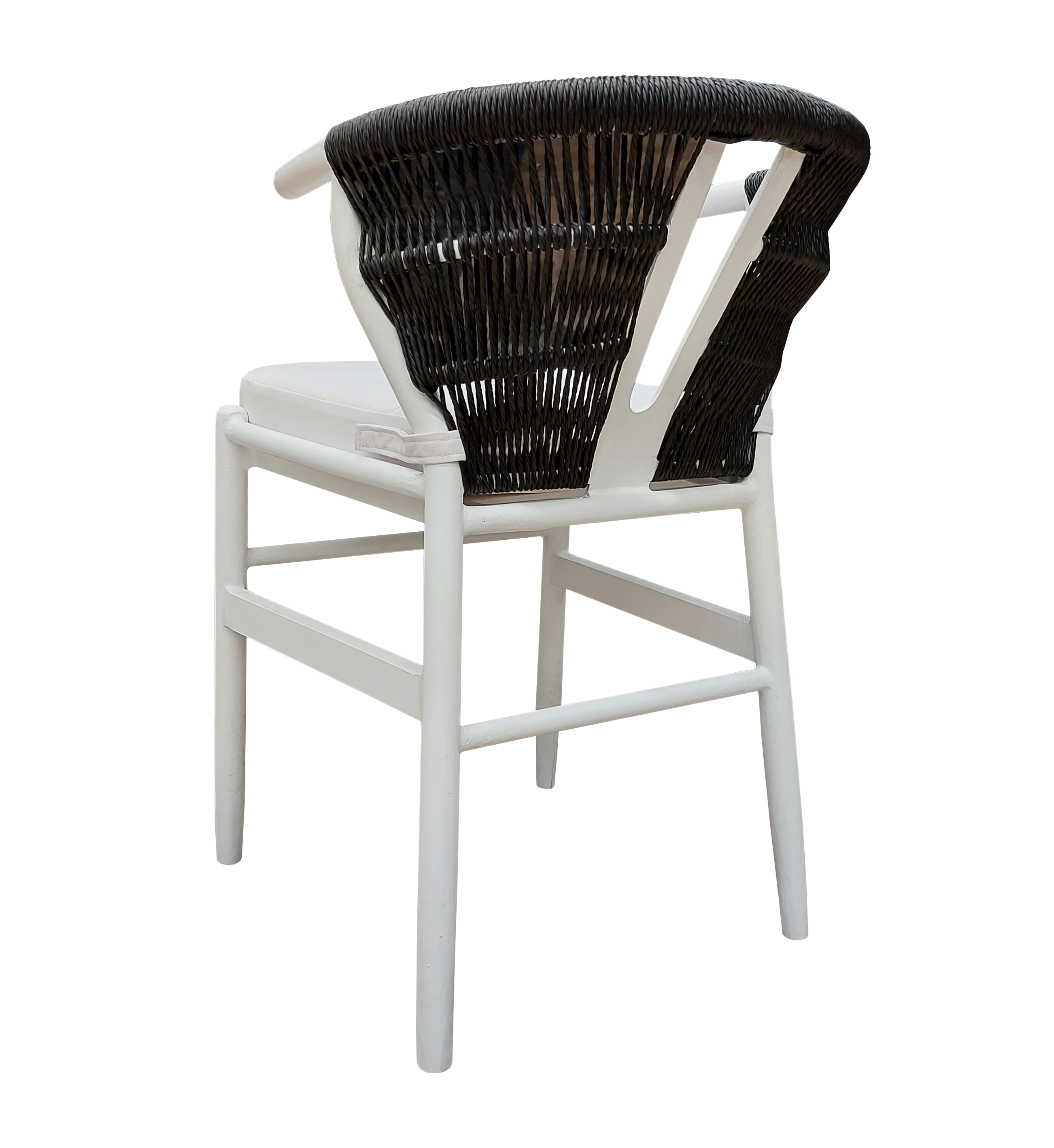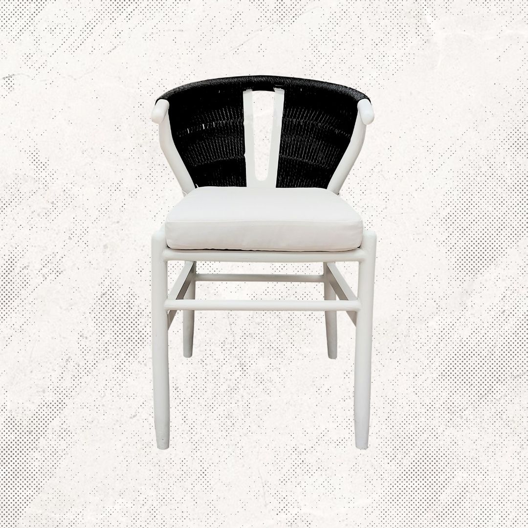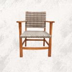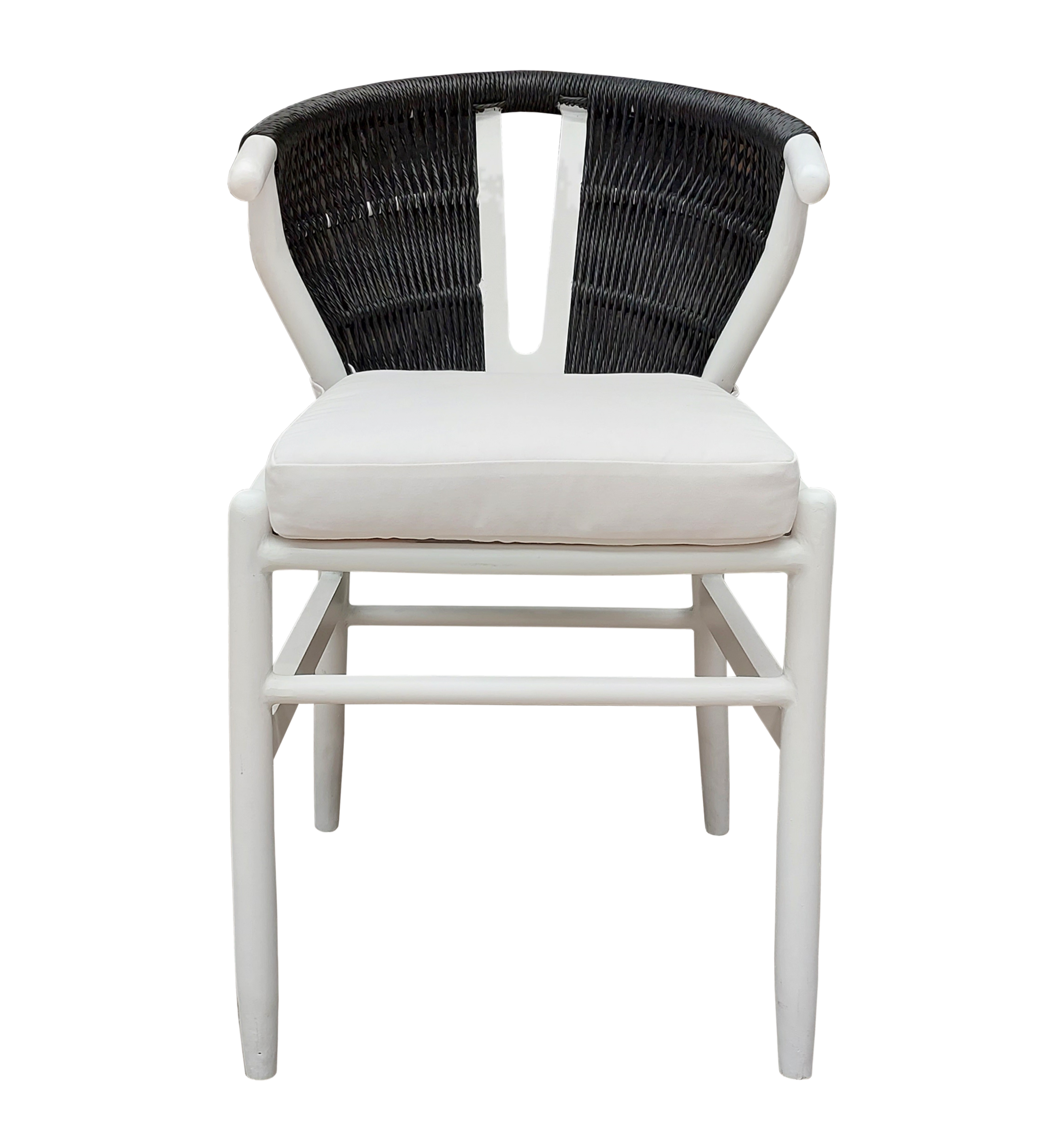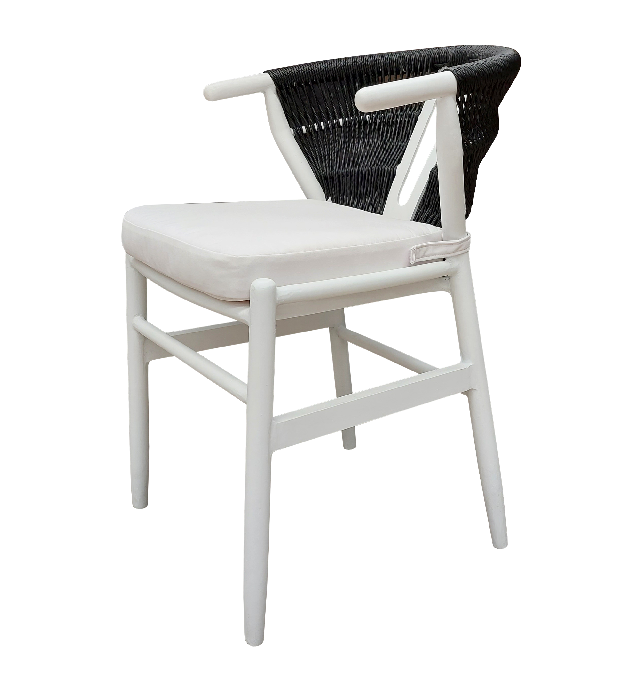 Estructura en madera y aluminio, tejido con rejilla sintética, cojineria fabricada con hule espuma de alta densidad y tela resistente al sol y la intemperie.