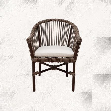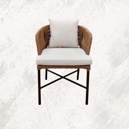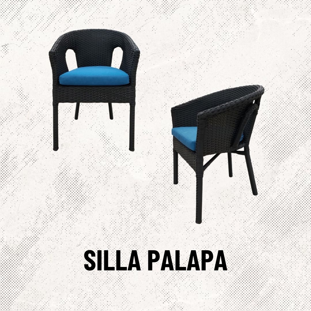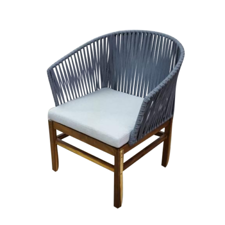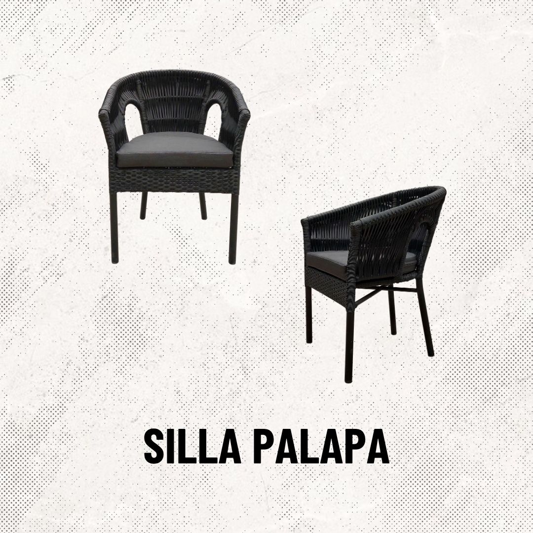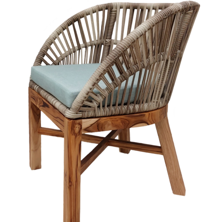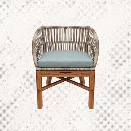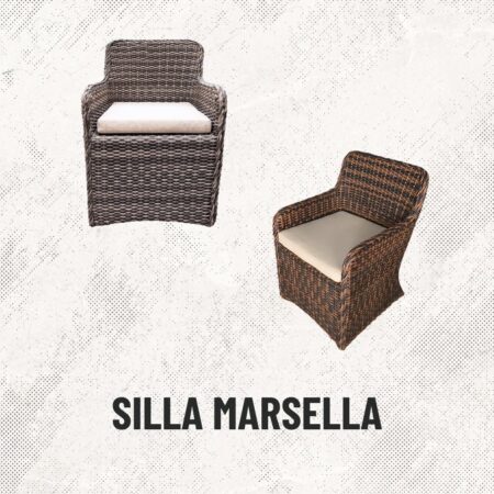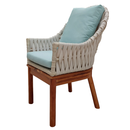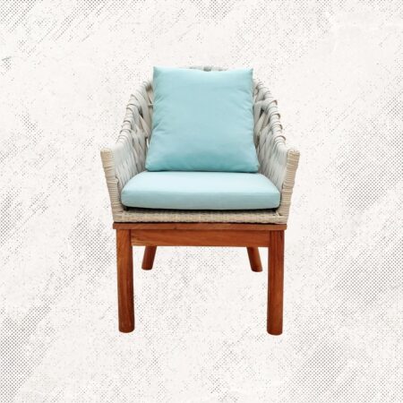 Estructura de madera y aluminio, tejido con rejilla sintética, cojineria fabricada con hule espuma de alta densidad y tela resistente al sol y la intemperie.