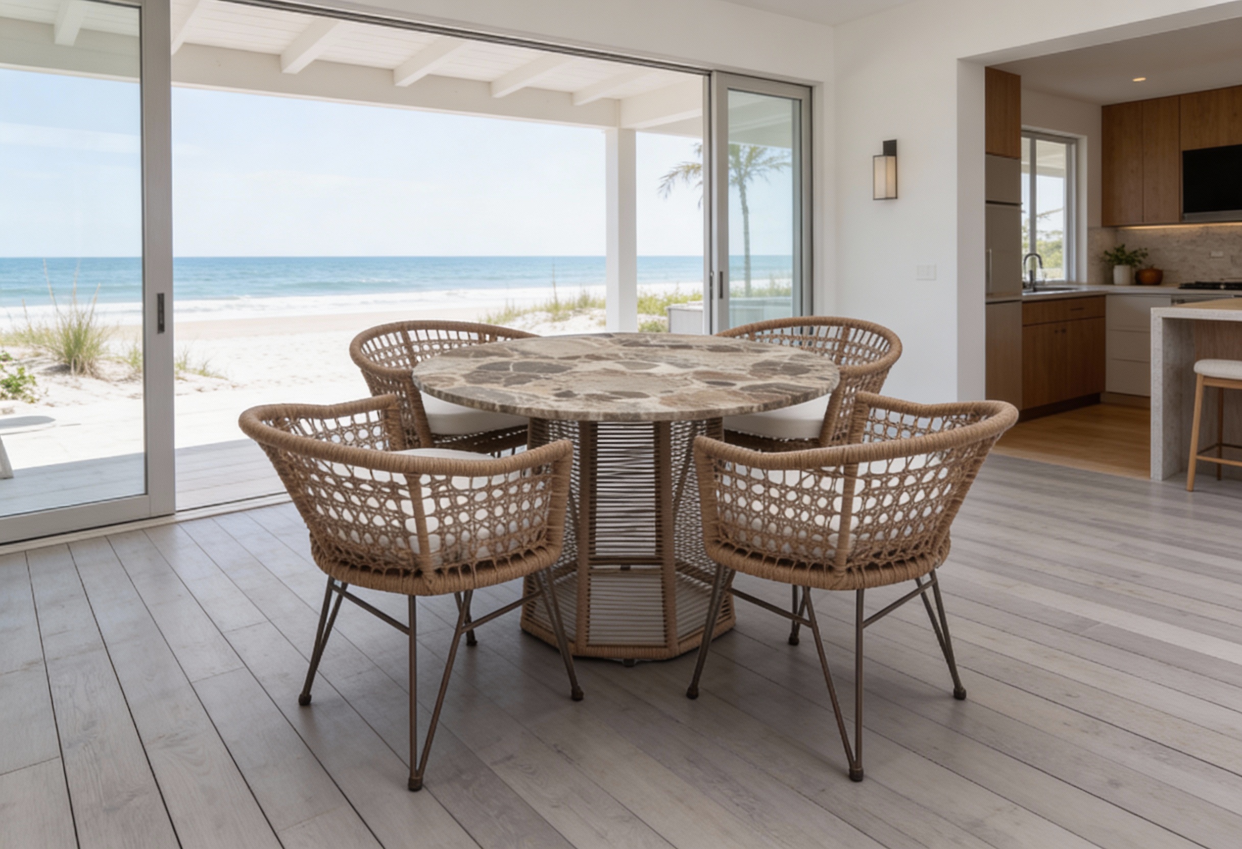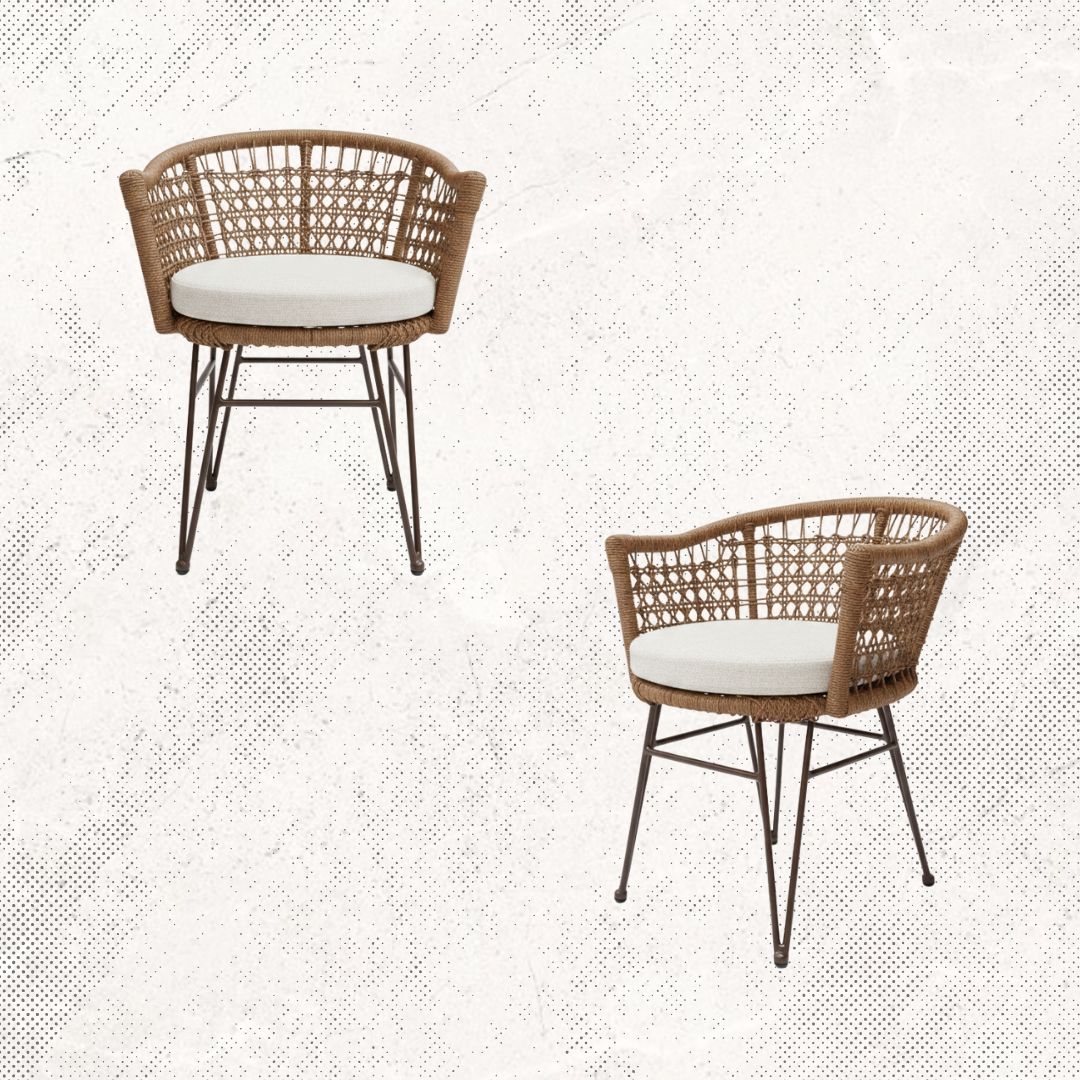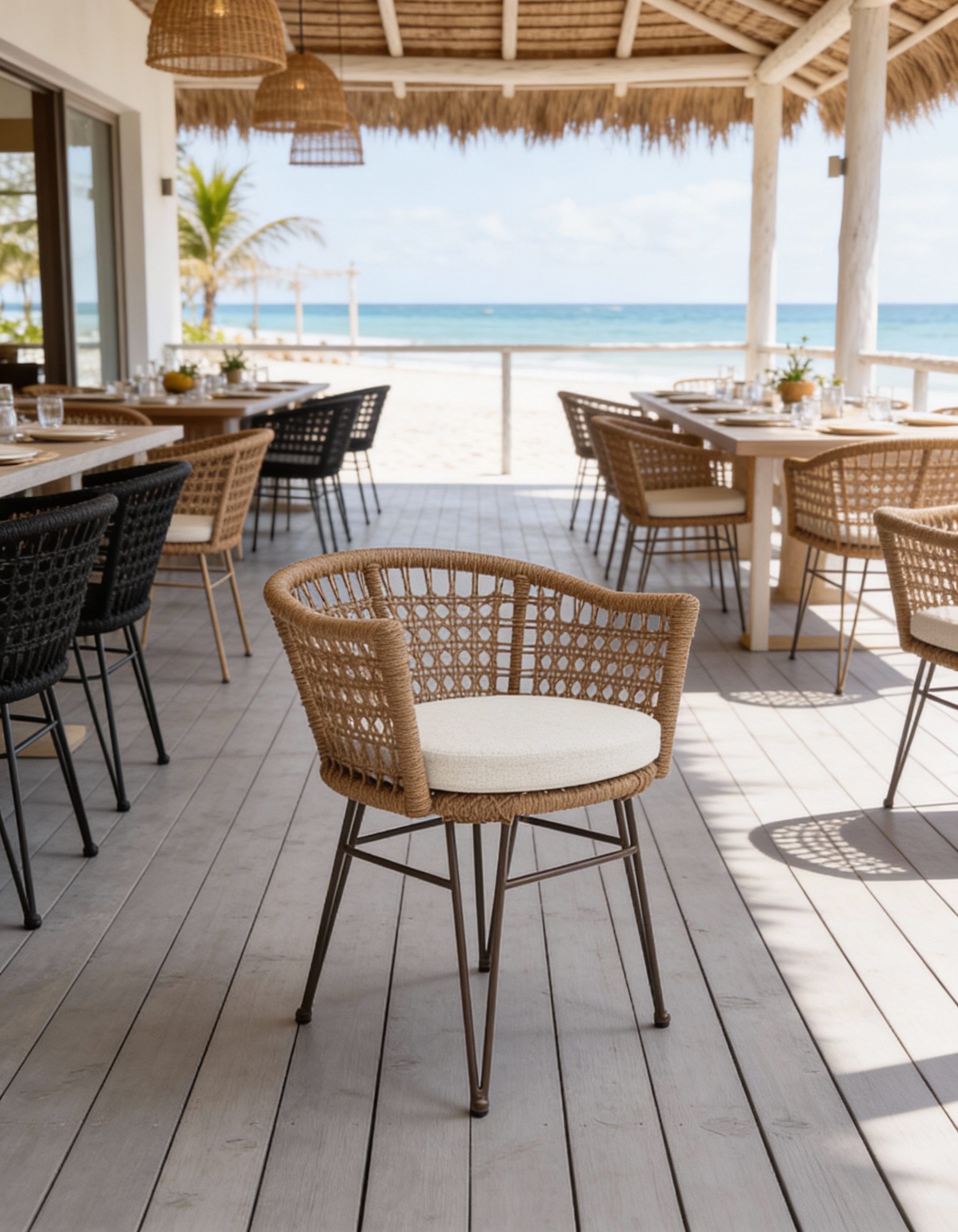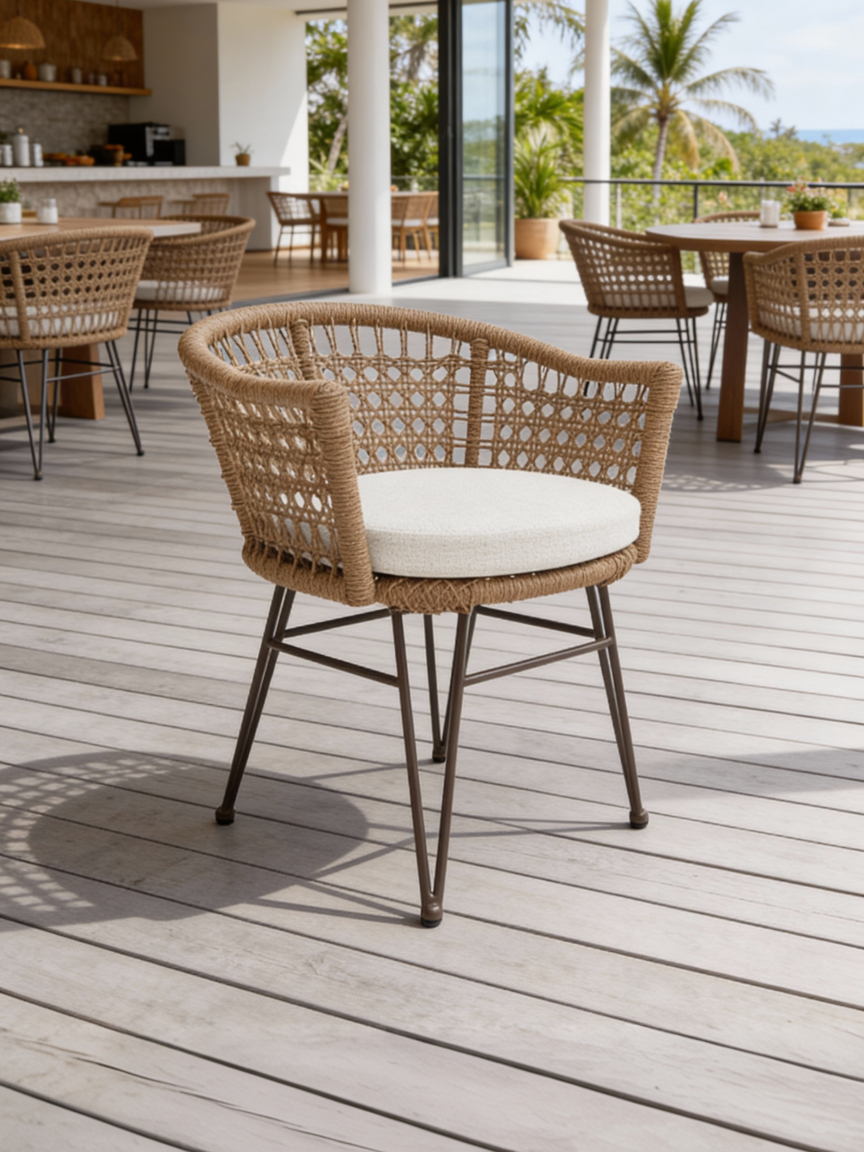 Estructura en madera y aluminio, tejido con rejilla sintética, cojineria fabricada con hule espuma de alta densidad y tela resistente al sol y la intemperie.