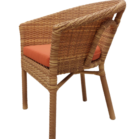 Estructura en madera y aluminio, tejido con rejilla sintética, cojineria fabricada con hule espuma de alta densidad y tela resistente al sol y la intemperie.