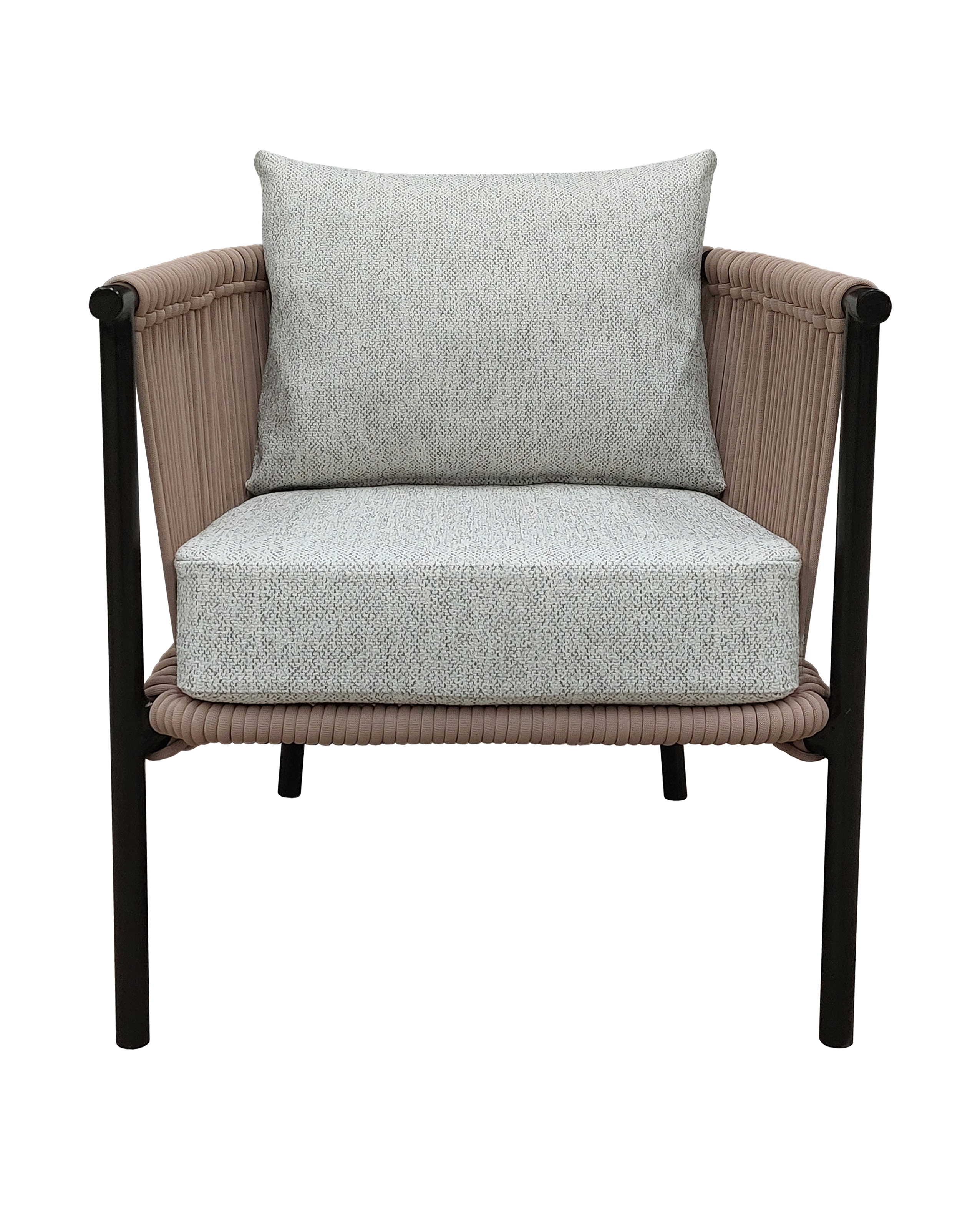 Materiales: Armazón de aluminio, tejido con rejilla sintética, cojín hule espuma de alta densidad, funda interna y funda en tela sunbrella con cierres reforzados..