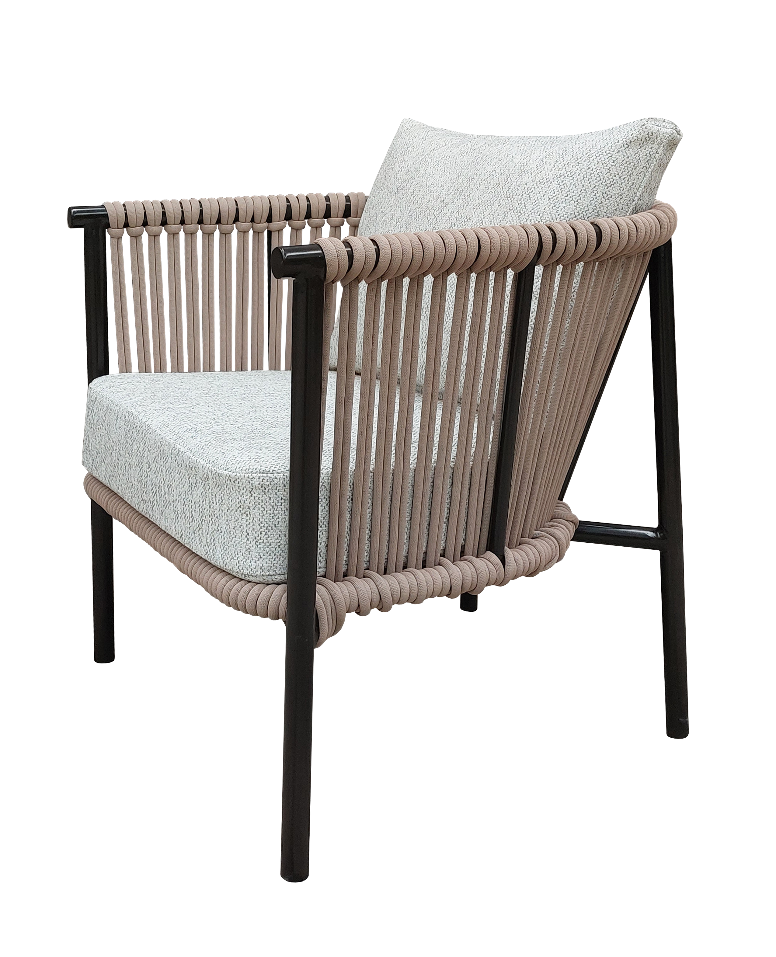 Estructura en madera y aluminio, tejido con rejilla sintética, cojineria fabricada con hule espuma de alta densidad y tela resistente al sol y la intemperie.