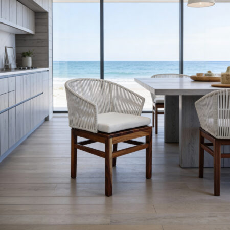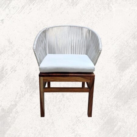 Estructura en madera y aluminio, tejido con rejilla sintética, cojineria fabricada con hule espuma de alta densidad y tela resistente al sol y la intemperie.