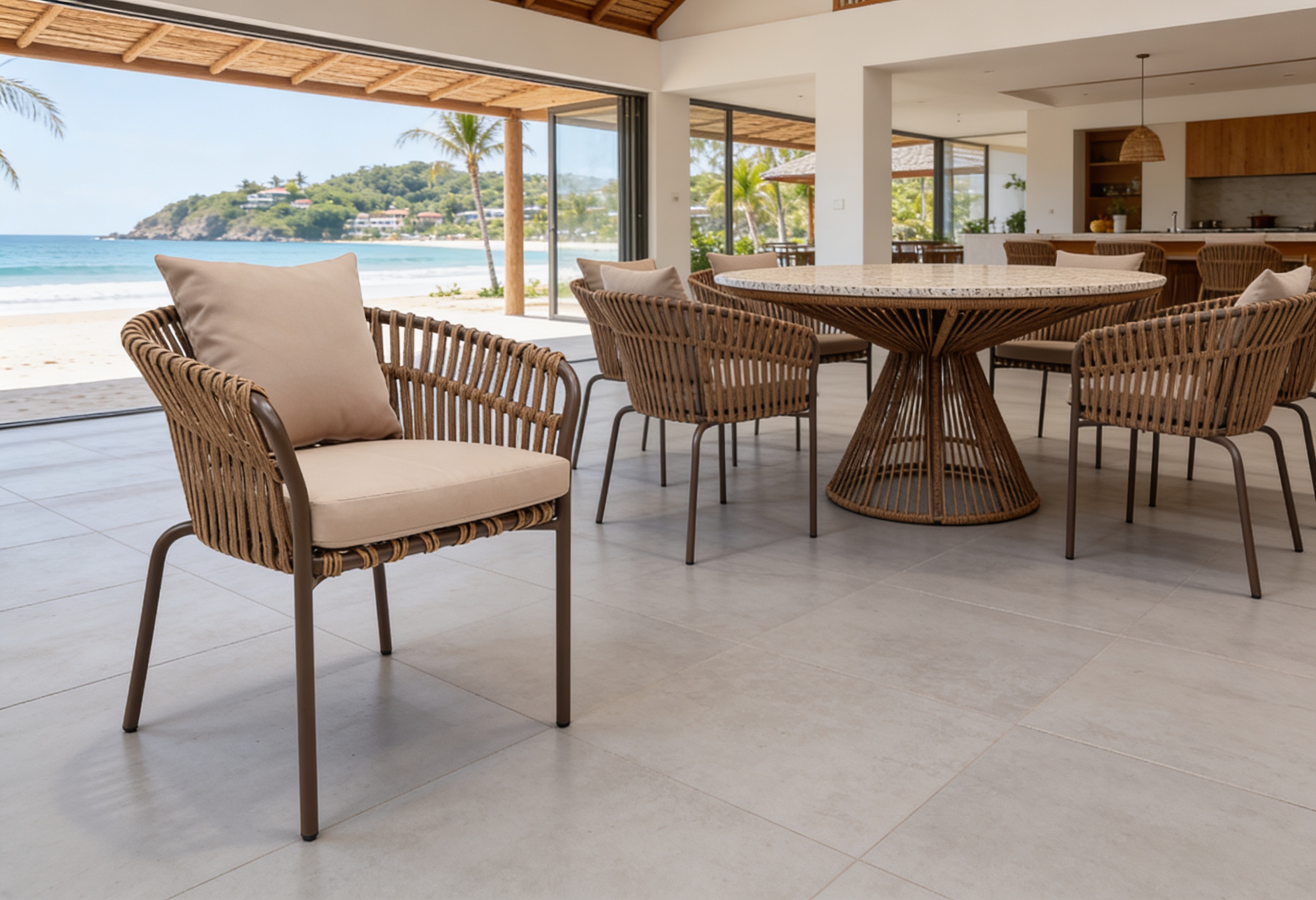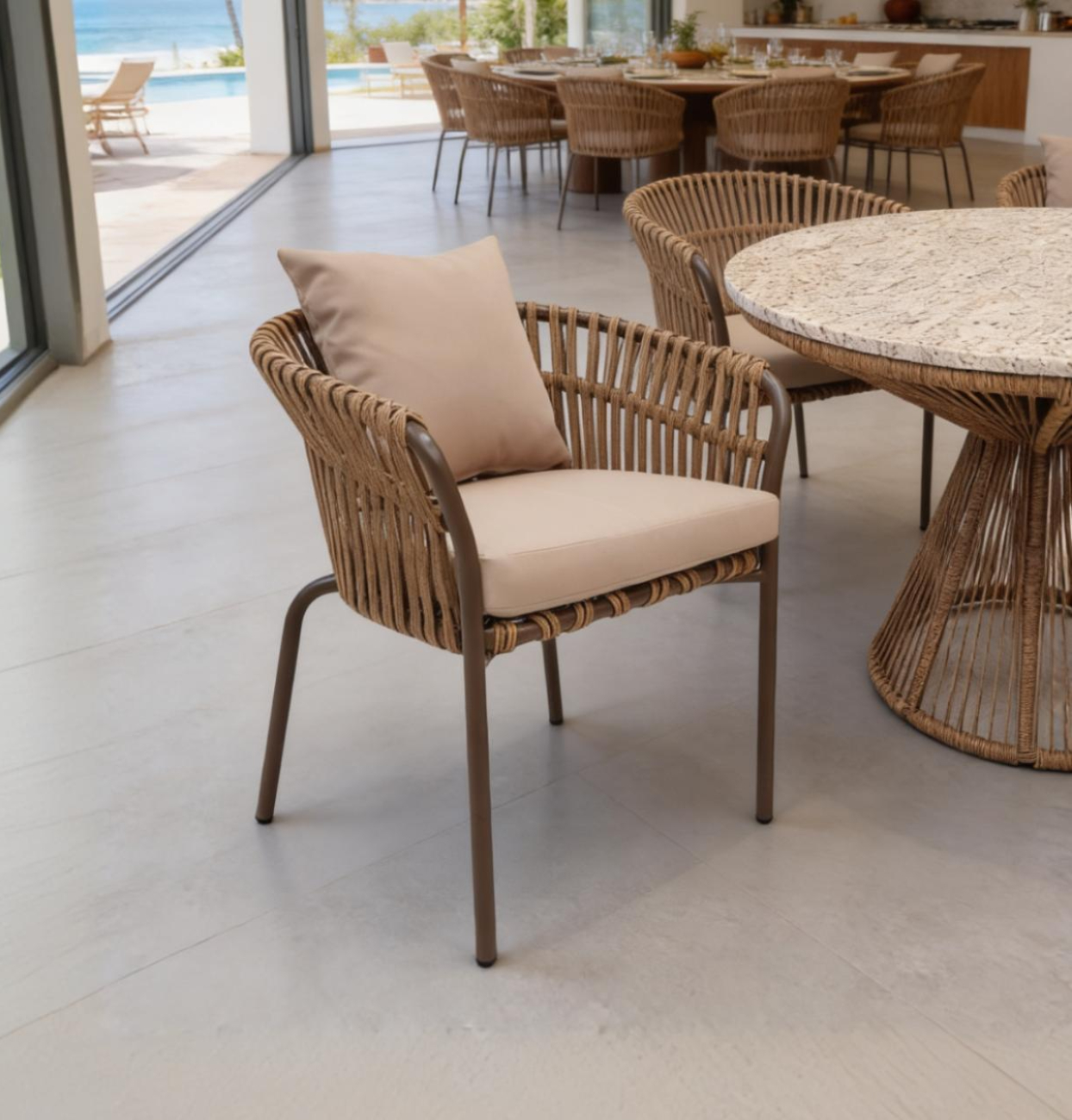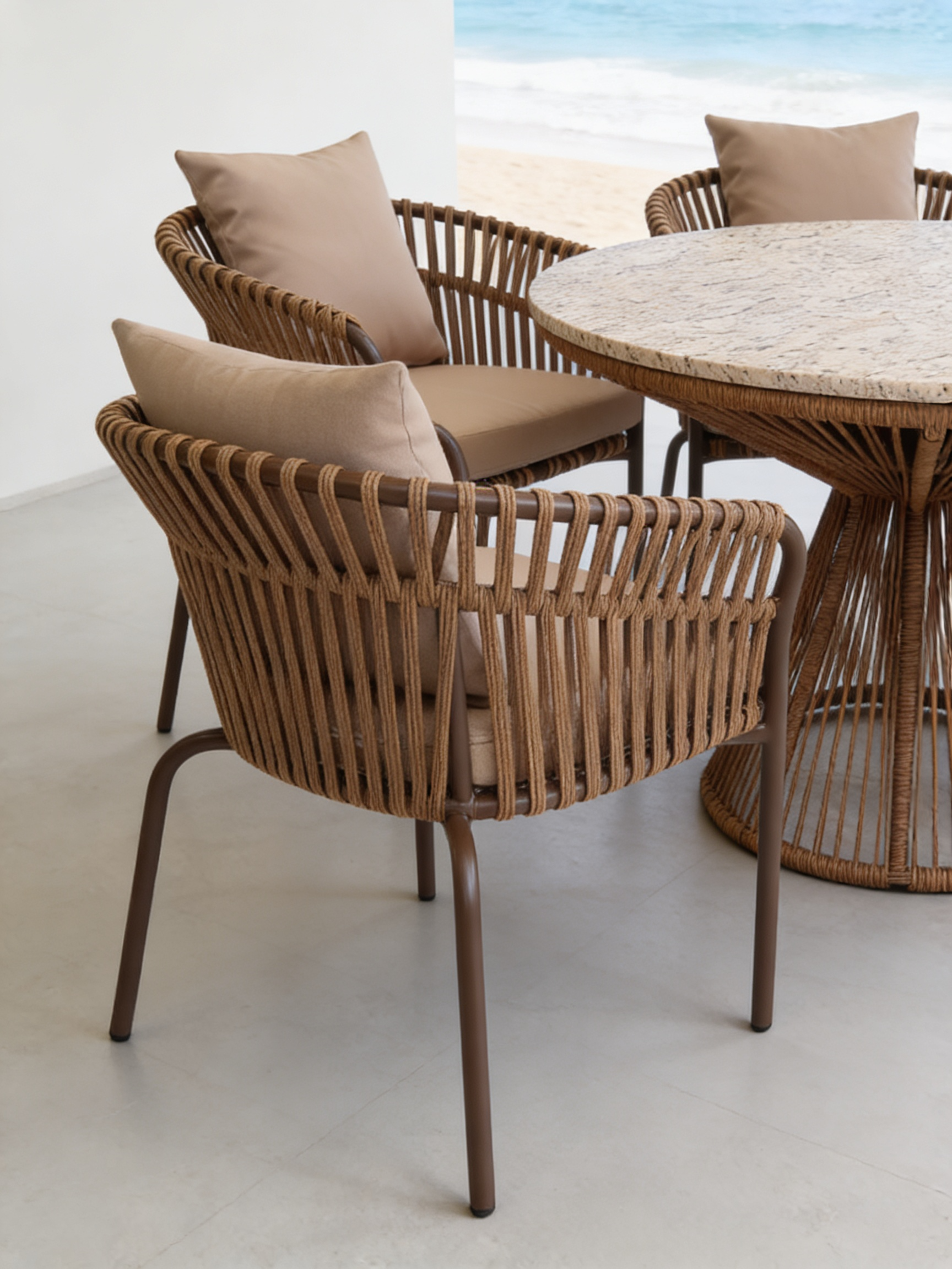 Estructura en madera y aluminio, tejido con rejilla sintética, cojineria fabricada con hule espuma de alta densidad y tela resistente al sol y la intemperie.