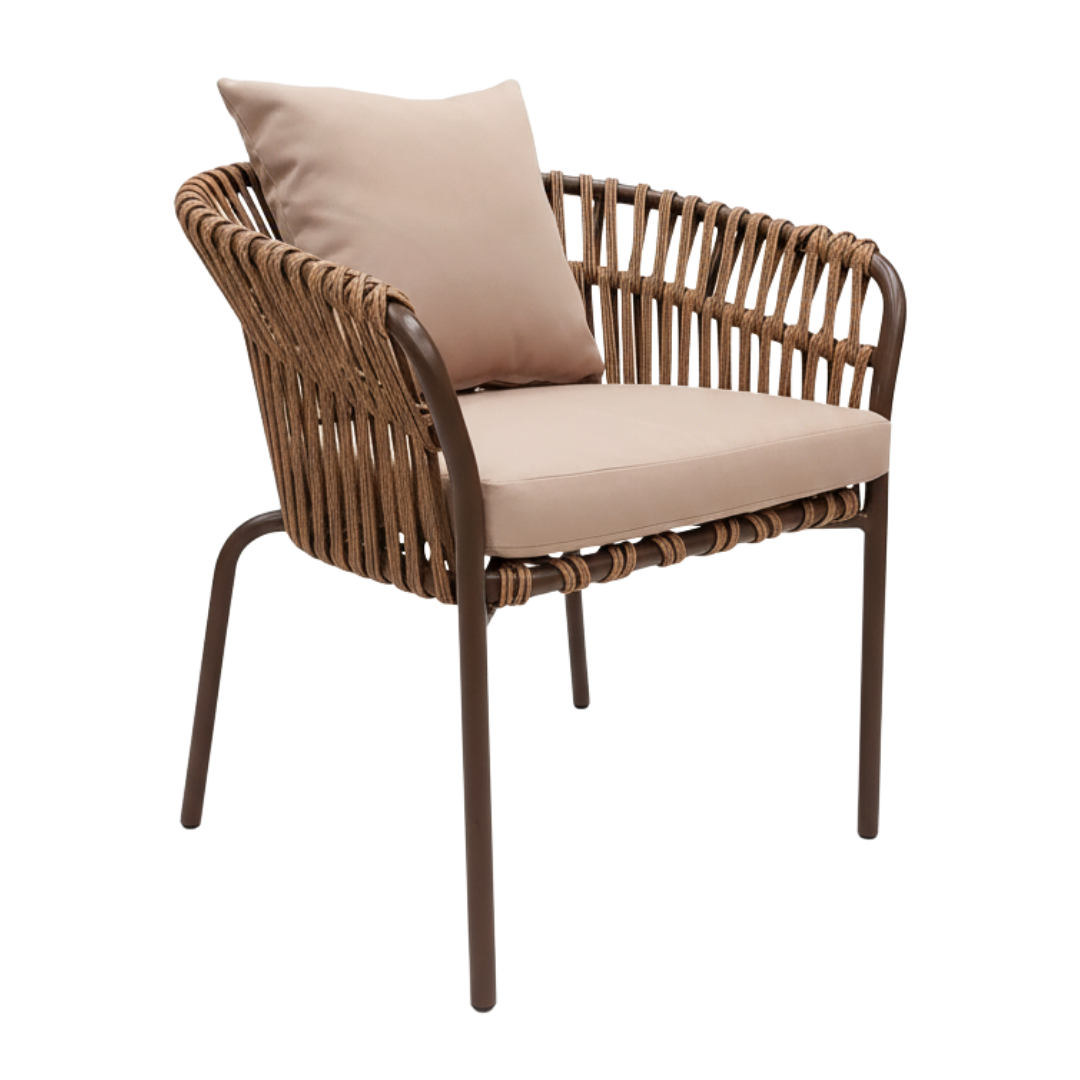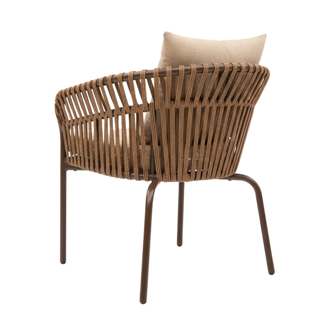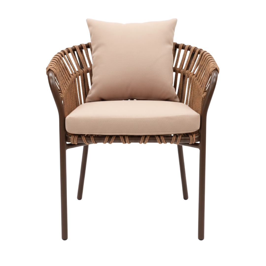 Estructura en madera y aluminio, tejido con rejilla sintética, cojineria fabricada con hule espuma de alta densidad y tela resistente al sol y la intemperie.