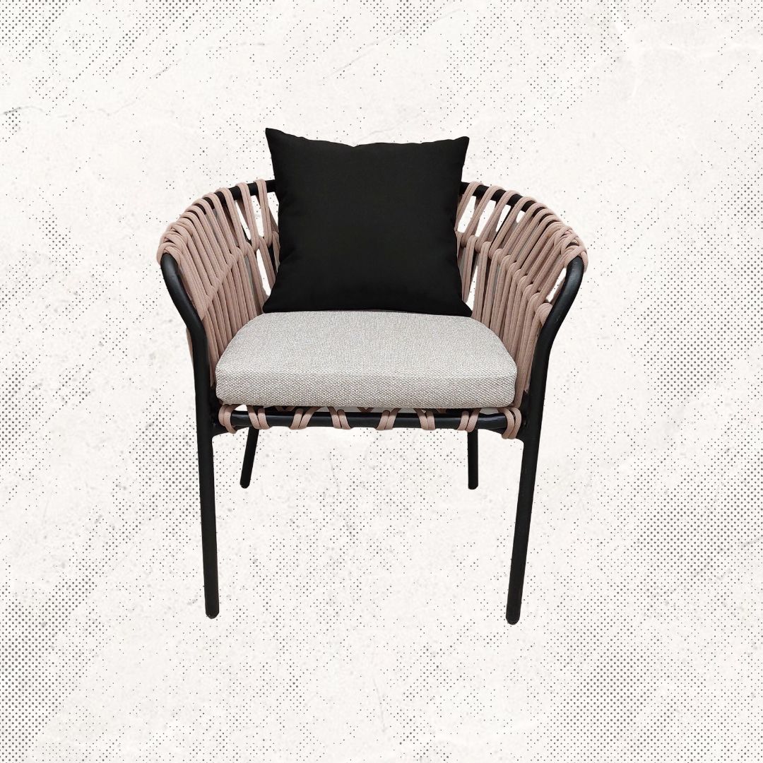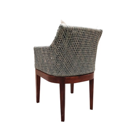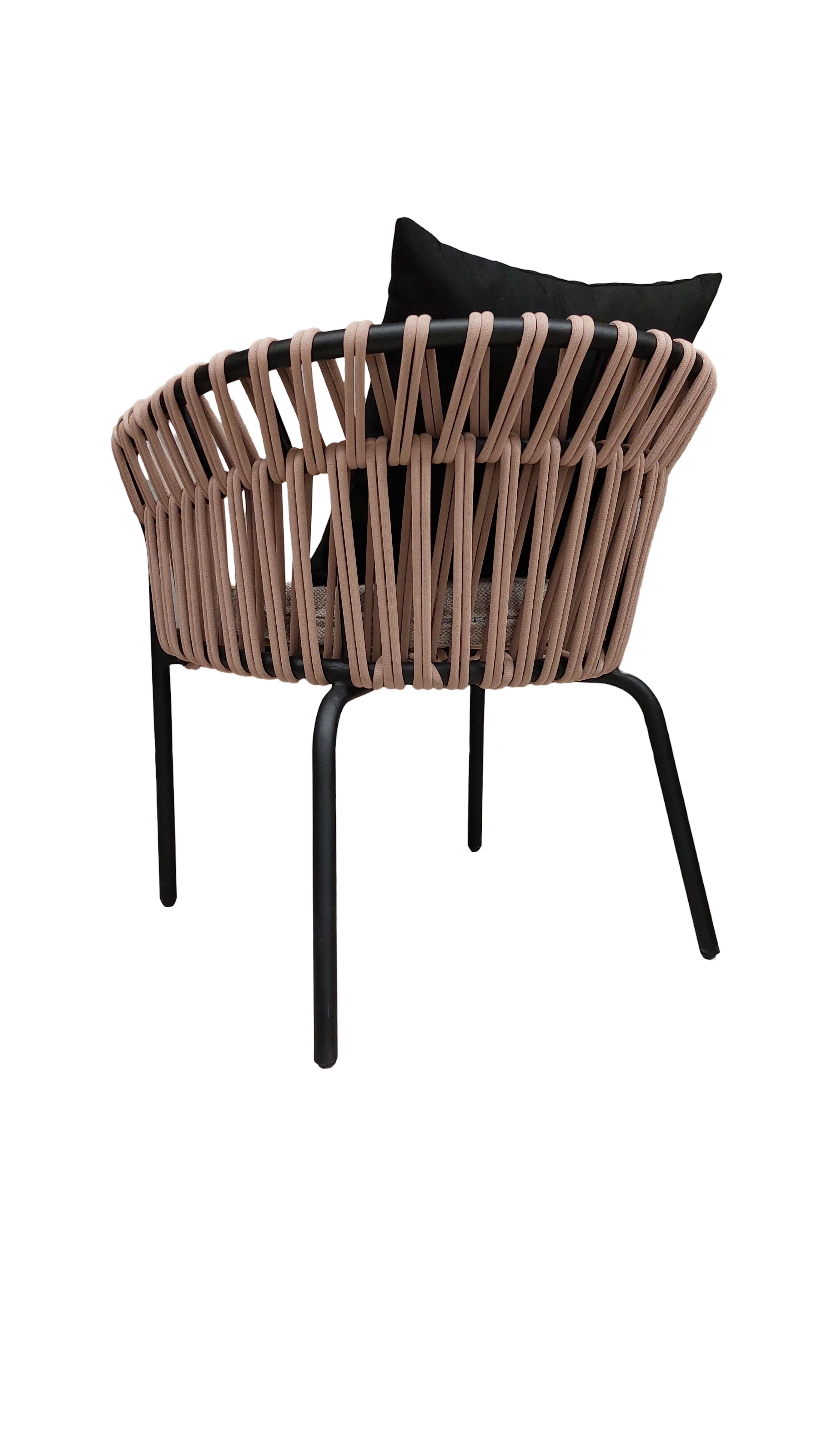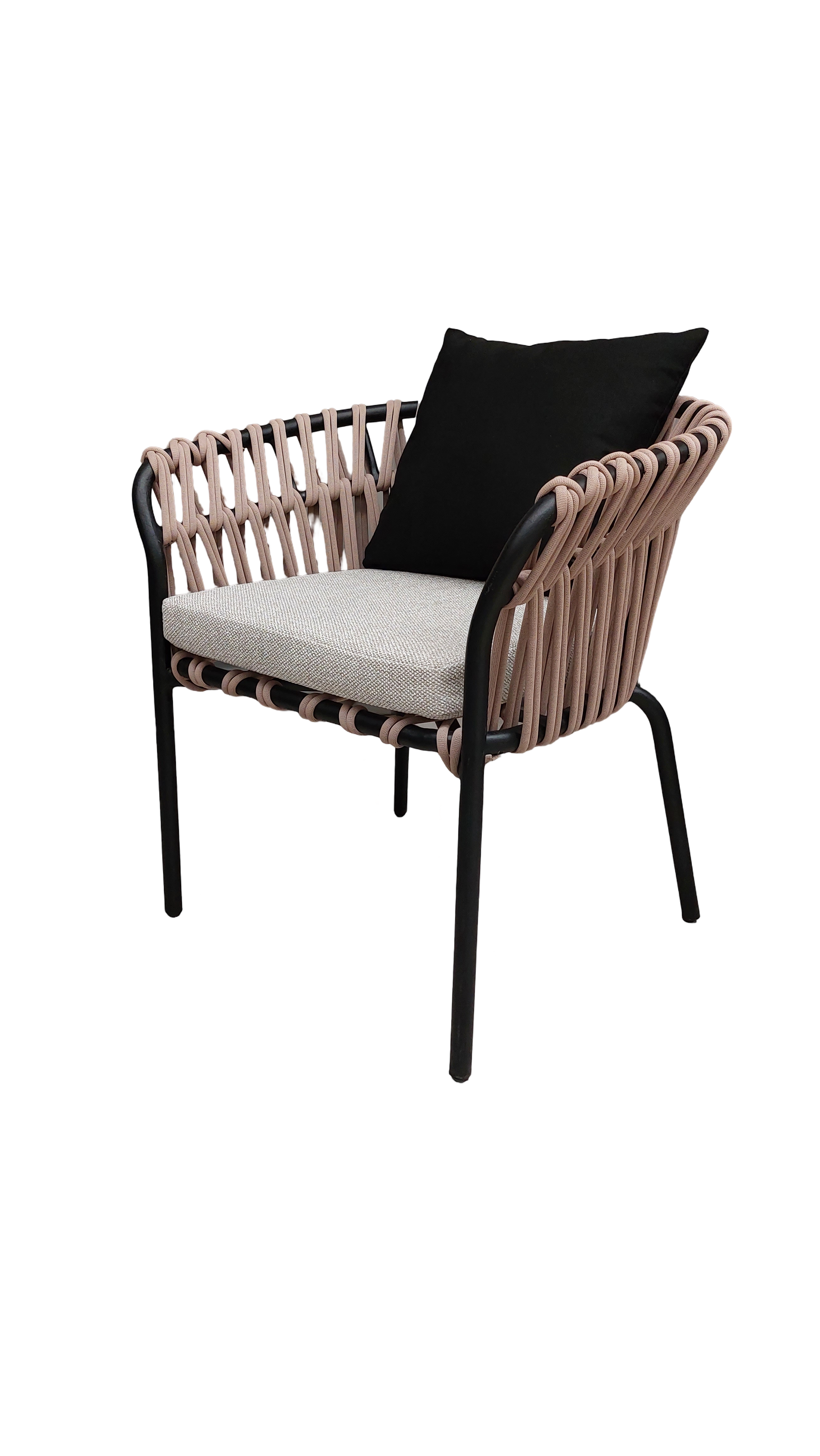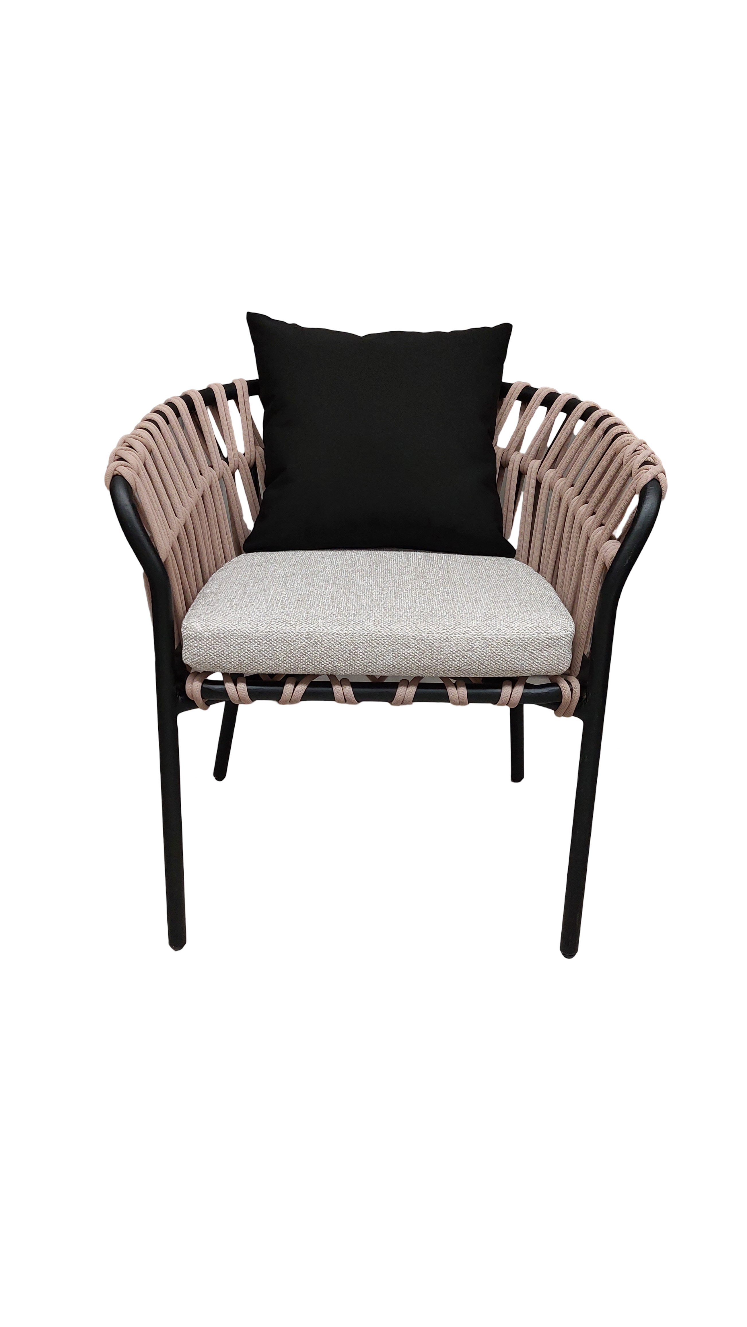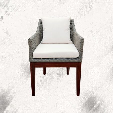Estructura en madera y aluminio, tejido con rejilla sintética, cojineria fabricada con hule espuma de alta densidad y tela resistente al sol y la intemperie.