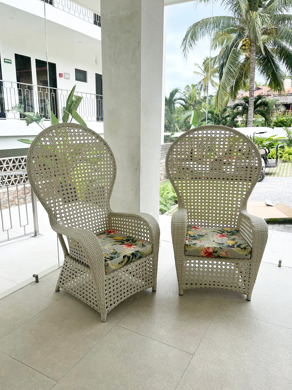 Materiales: Silla con estructura de aluminio tejida con rejilla sintética de alta calidad, cojinería fabricada con hule espuma de alta densidad y tela resistente al sol y la intemperie.