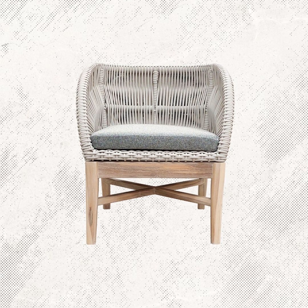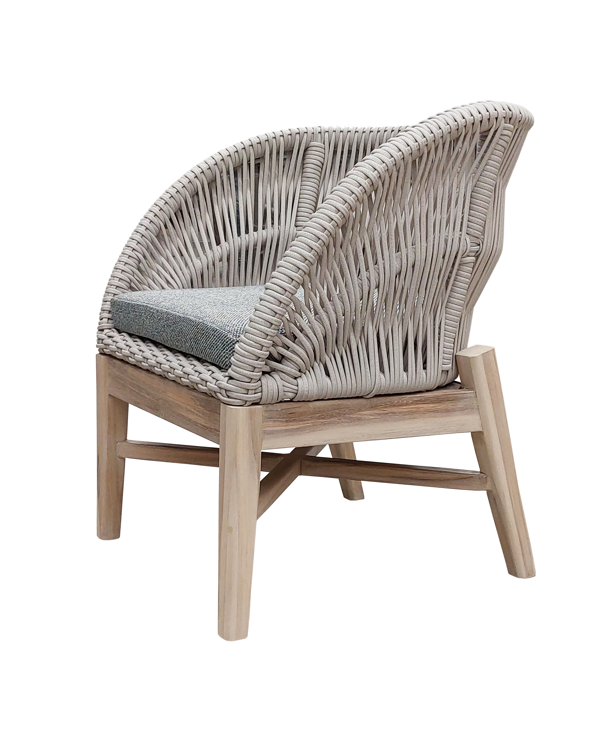 Materiales: Silla con estructura de aluminio tejida con rejilla sintética de alta calidad, cojinería fabricada con hule espuma de alta densidad y tela resistente al sol y la intemperie.