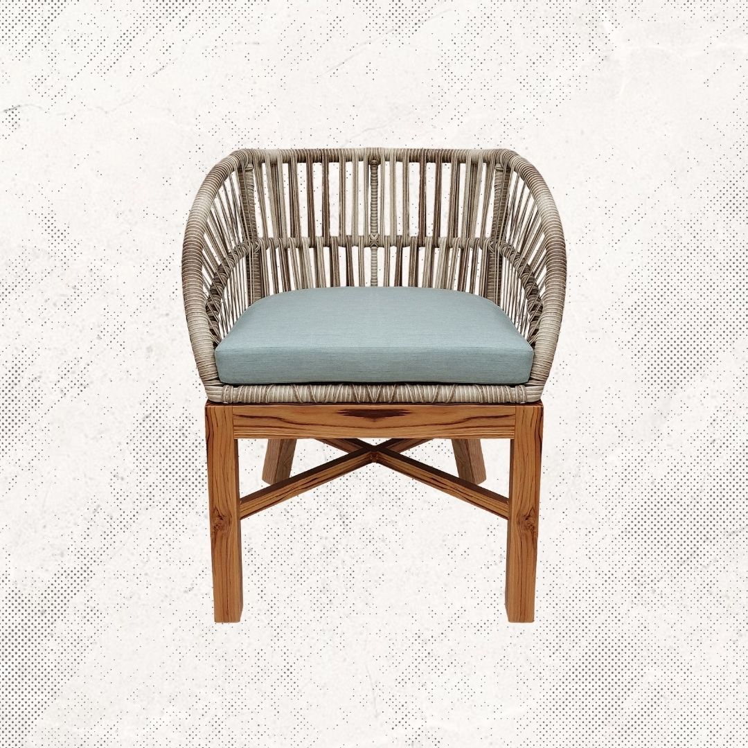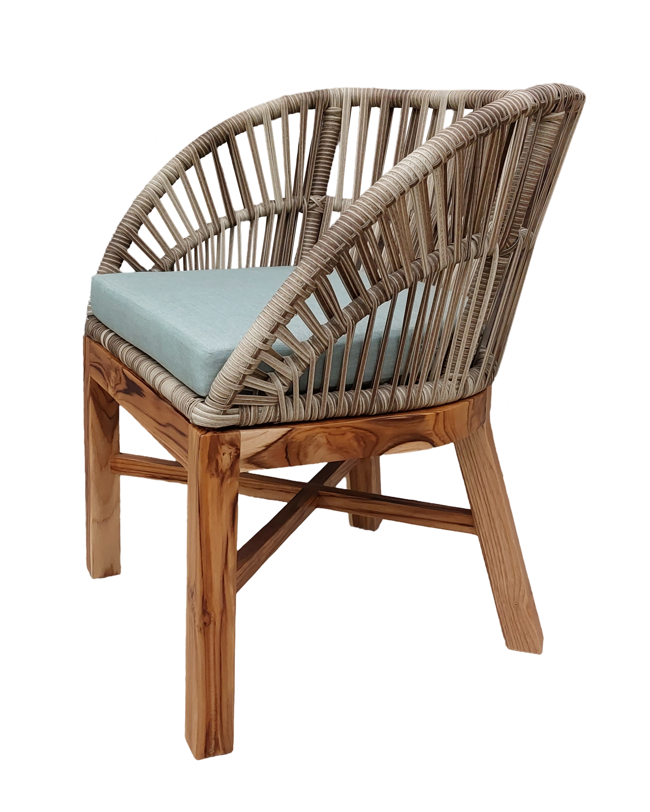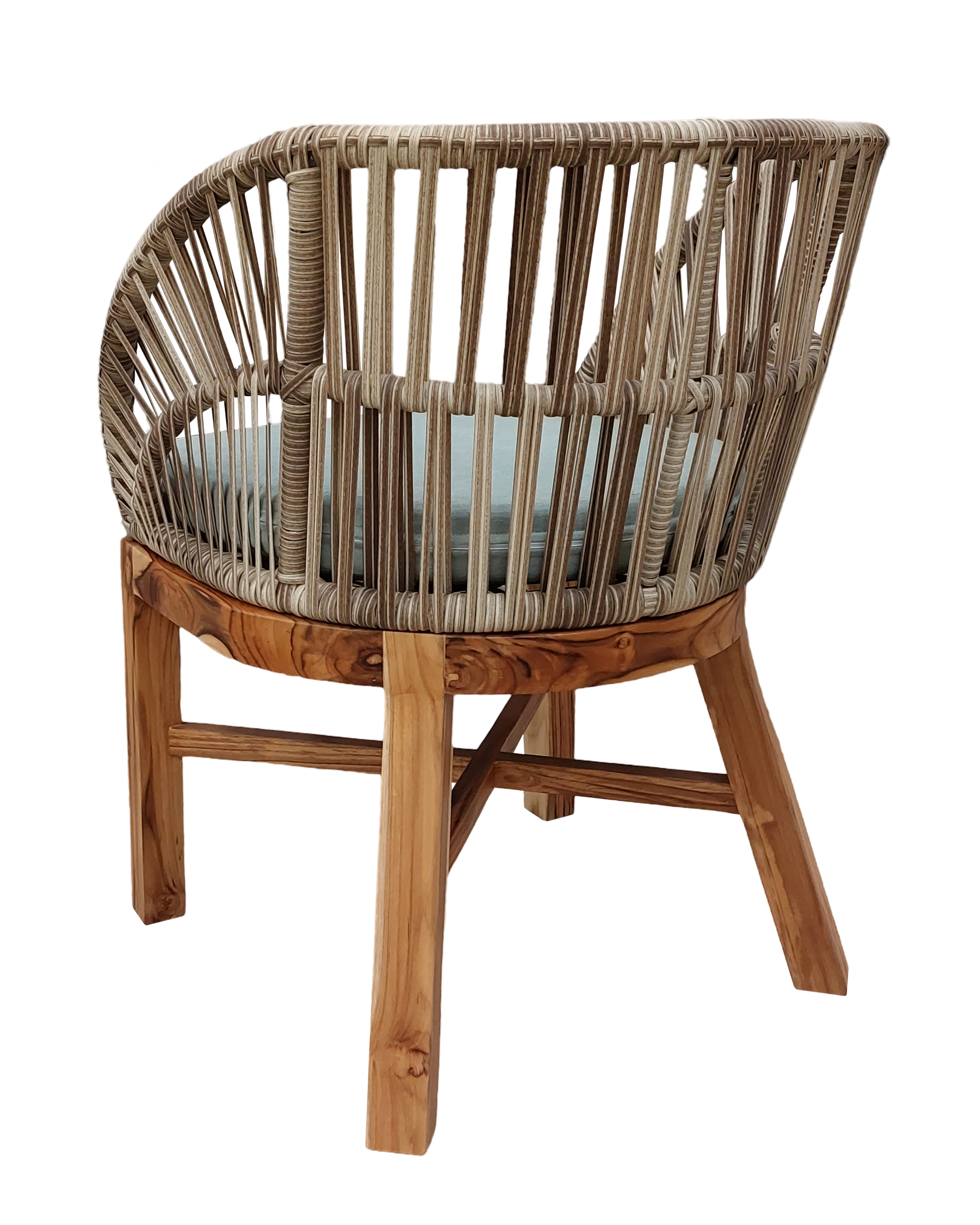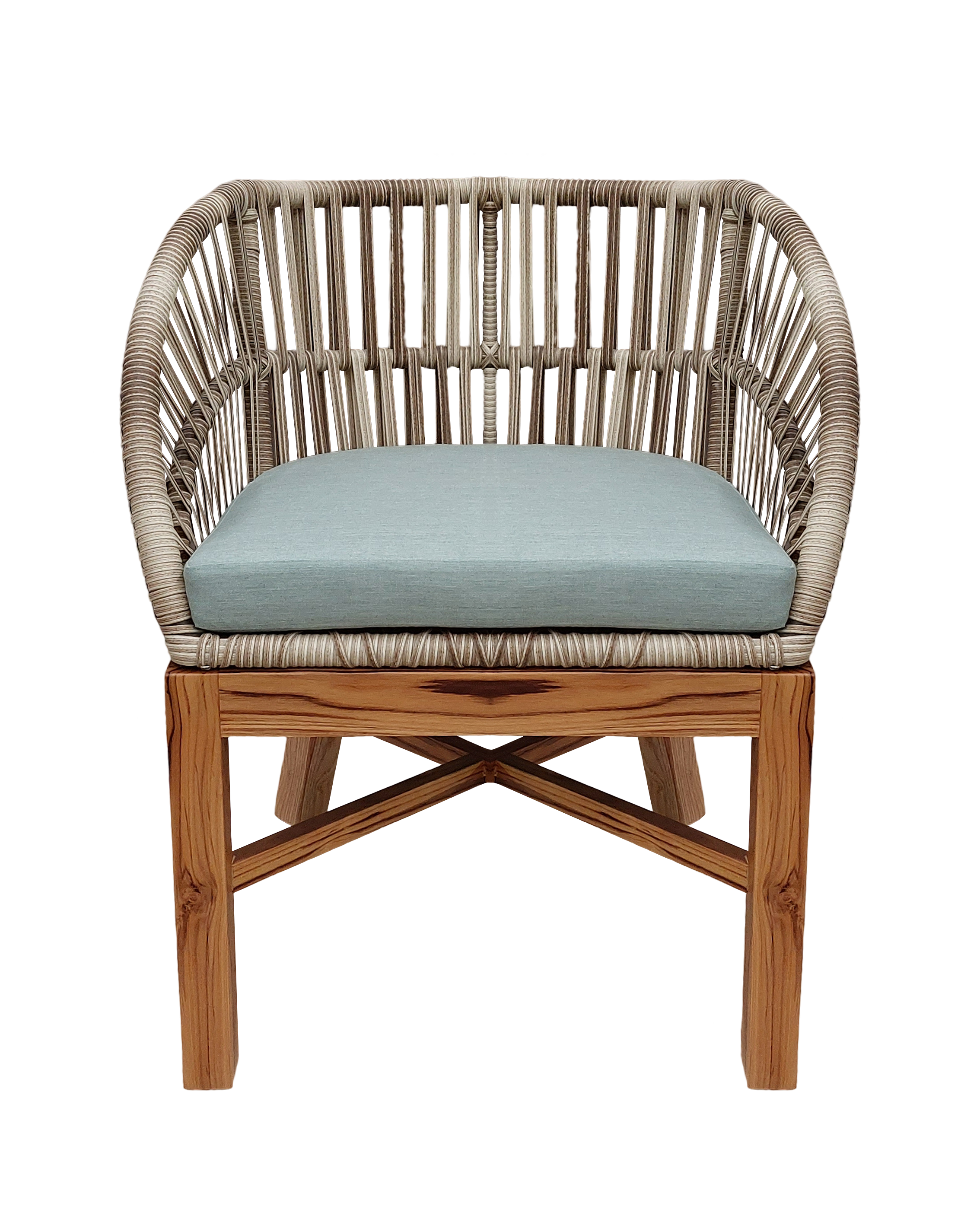 Materiales: Silla con estructura de aluminio tejida con rejilla sintética de alta calidad, cojinería fabricada con hule espuma de alta densidad y tela resistente al sol y la intemperie.