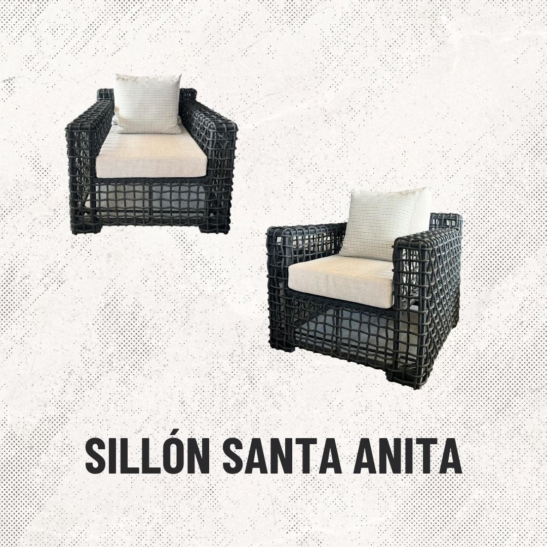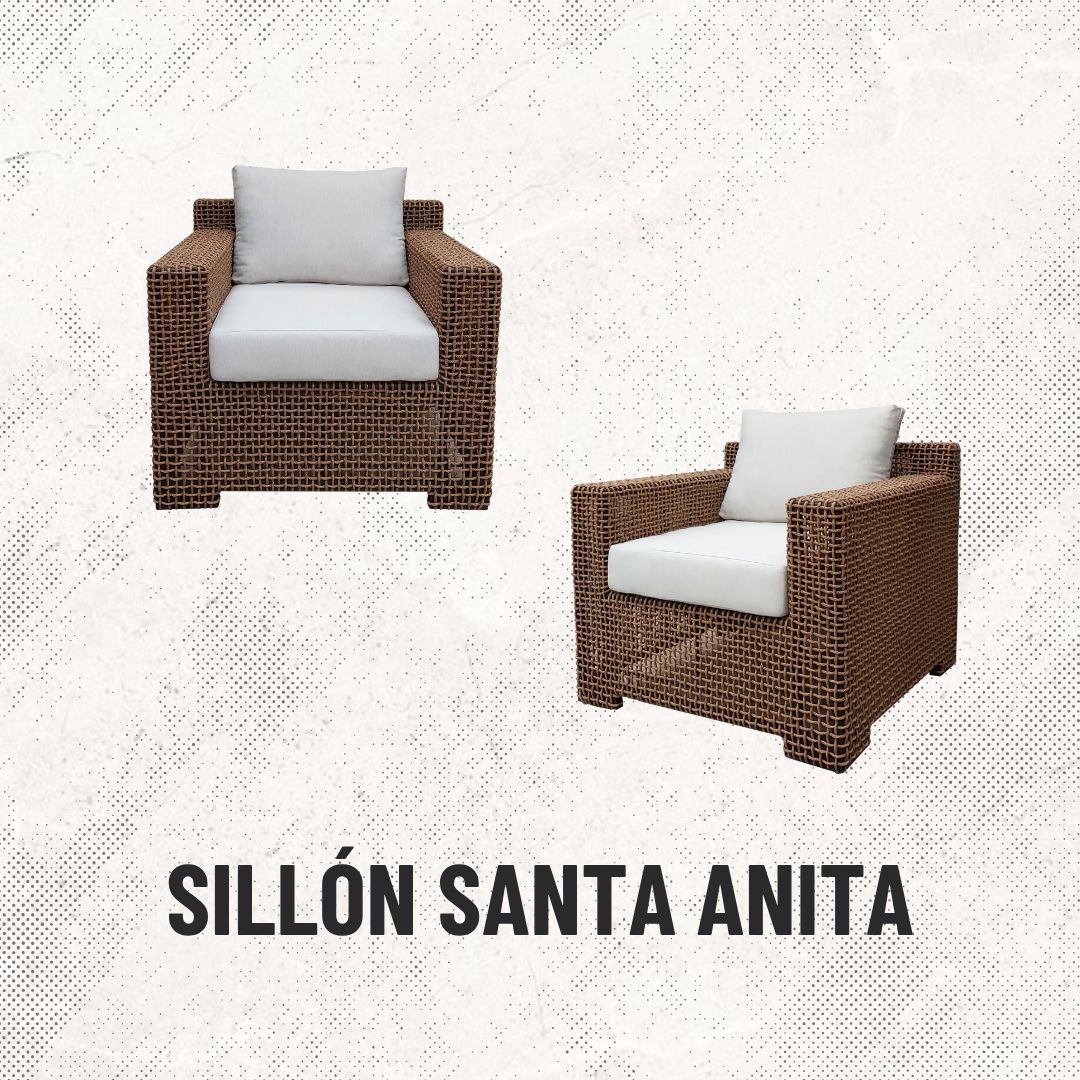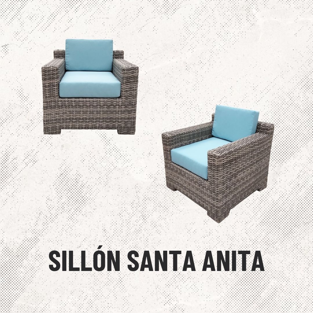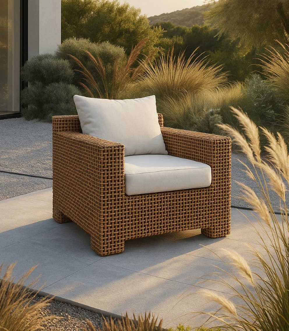 Sillón fabricado con estructura de madera, tejidas con rejilla sintética, cojinería fabricada con hule espuma de alta densidad y tela resistente al sol y la intemperie.