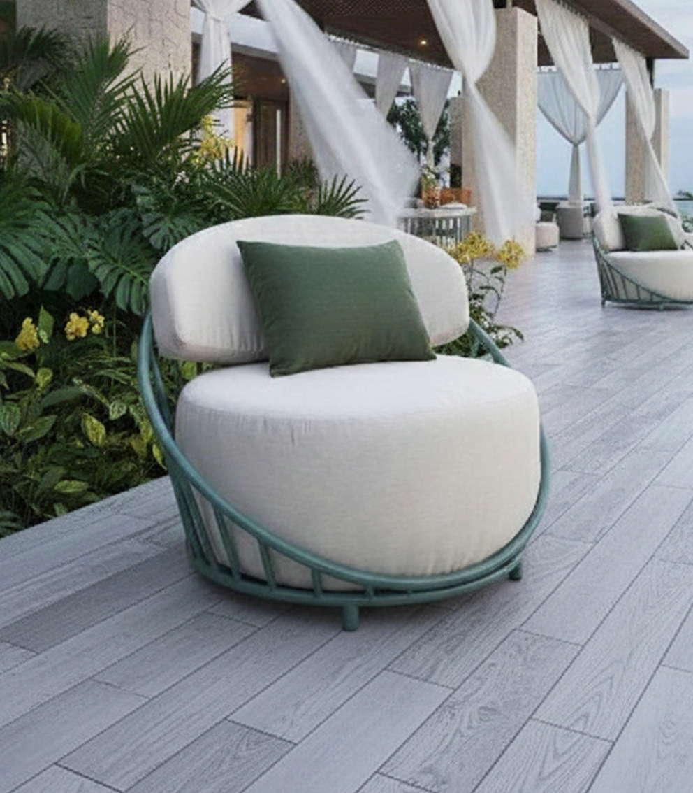 Estructura en aluminio, tejido con rejilla sintética, cojineria fabricada con hule espuma de alta densidad y tela resistente al sol y la intemperie