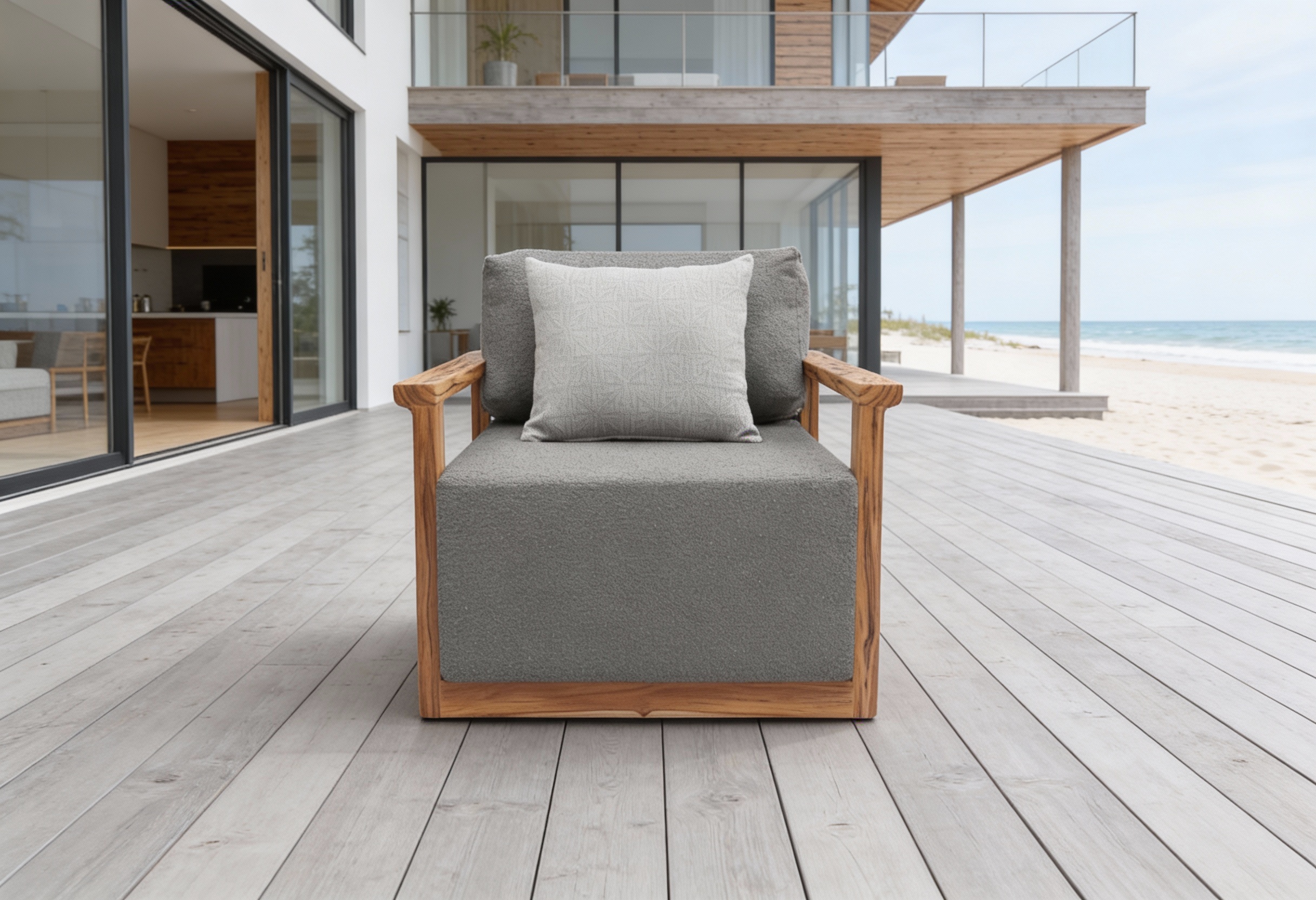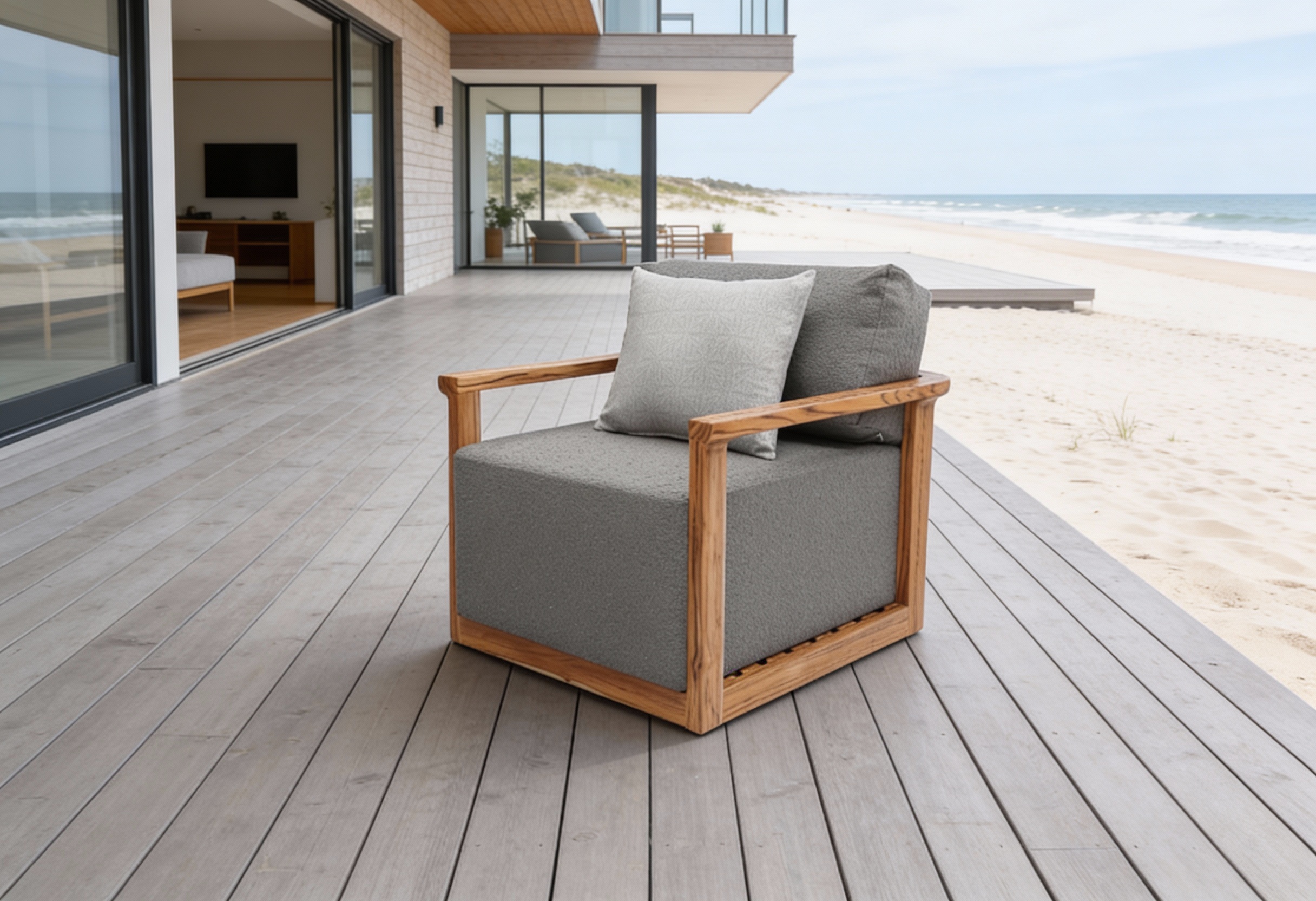 Materiales: Armazón de aluminio y madera, tejido con rejilla sintética, cojín hule espuma de alta densidad, funda interna, funda externa en tela resistente al sol y la intemperie con cierres reforzados.