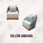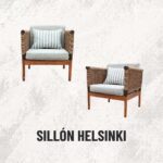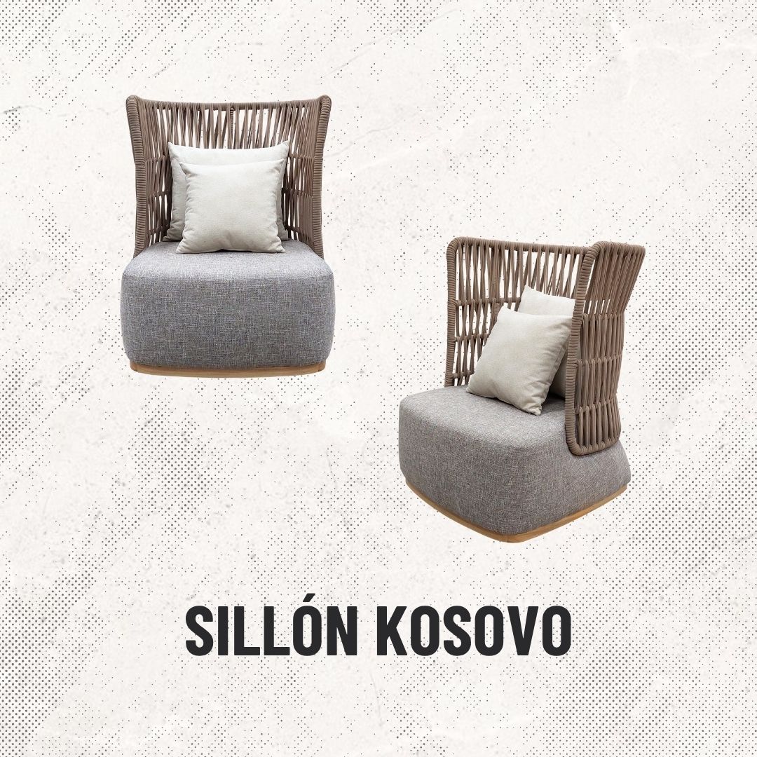 Sillón fabricado con estructura de madera, tejidas con rejilla sintética, cojinería fabricada con hule espuma de alta densidad y tela resistente al sol y la intemperie.