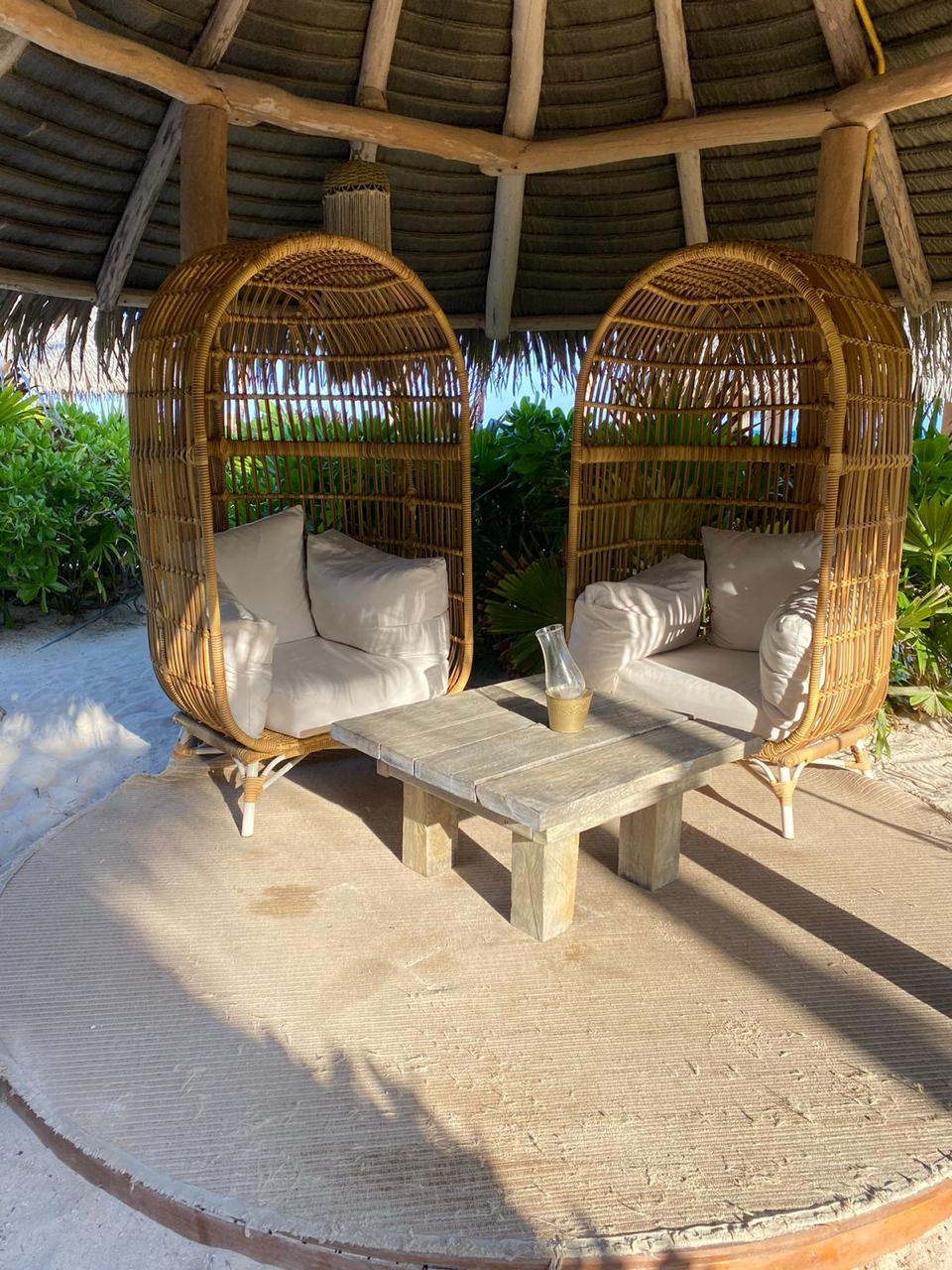 Madera de parota y cojines en tela sumbrella, hule espuma de alta densidad.