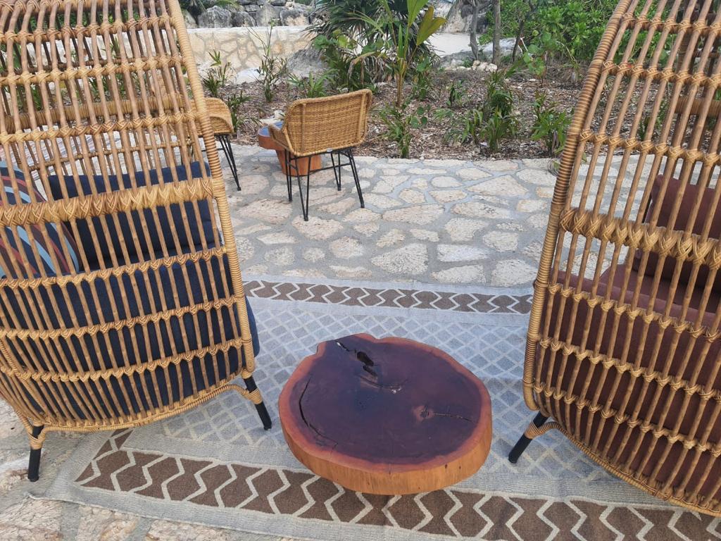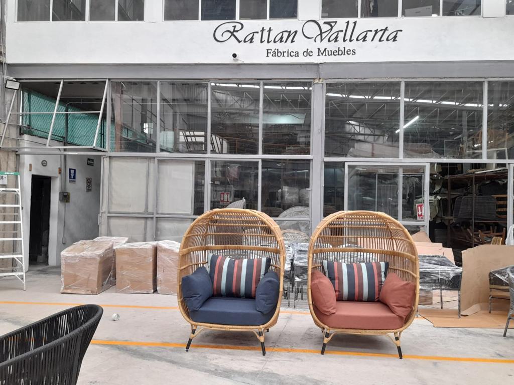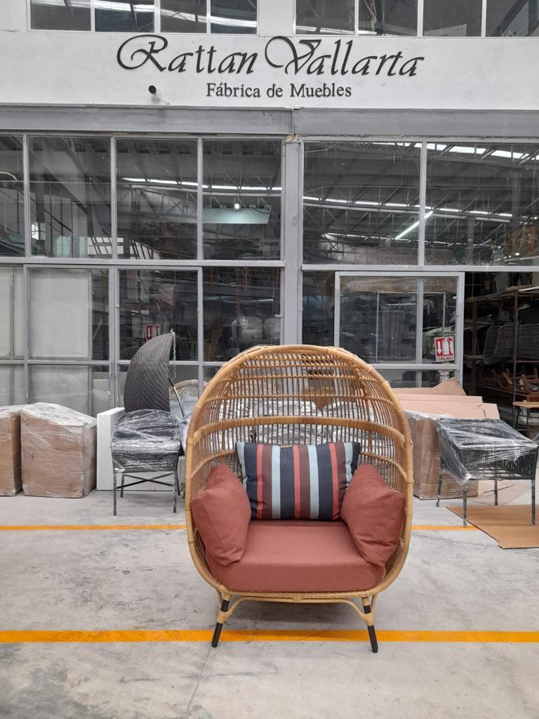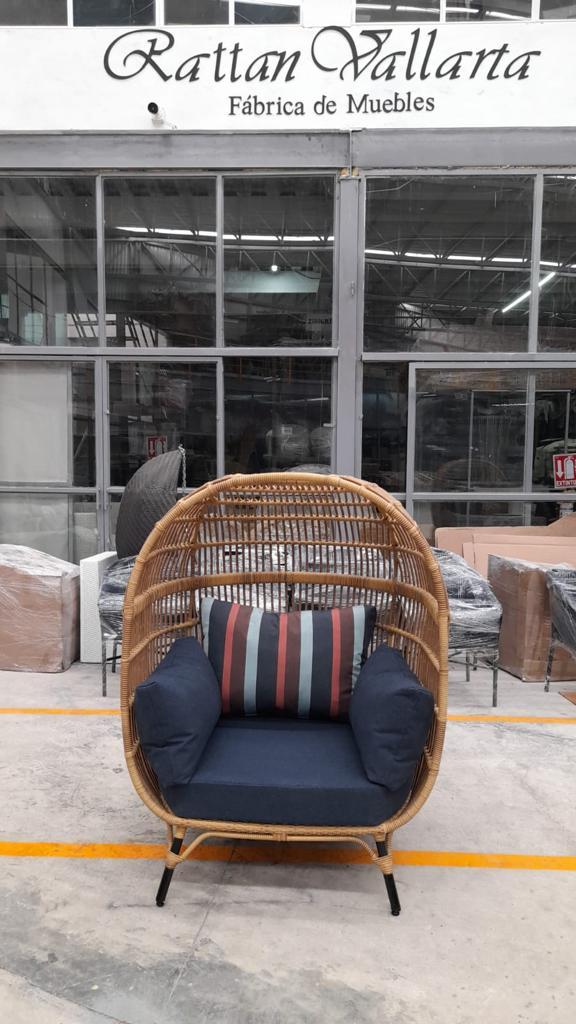 Sillón fabricado con estructura de madera, tejidas con rejilla sintética, cojinería fabricada con hule espuma de alta densidad y tela resistente al sol y la intemperie.