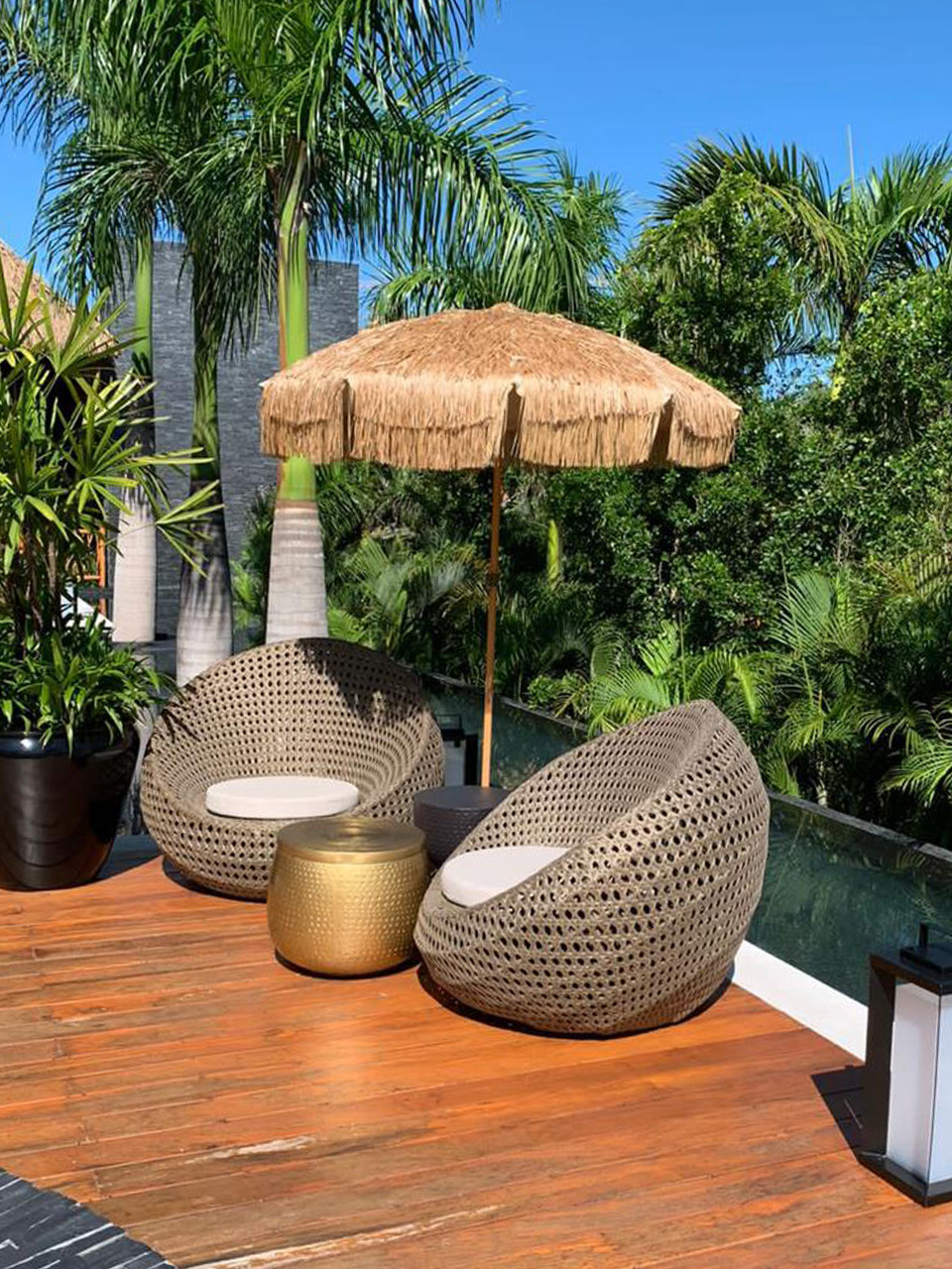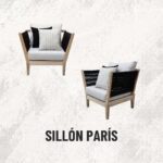 Sillón fabricado con estructura de madera, tejidas con rejilla sintética, cojinería fabricada con hule espuma de alta densidad y tela resistente al sol y la intemperie.