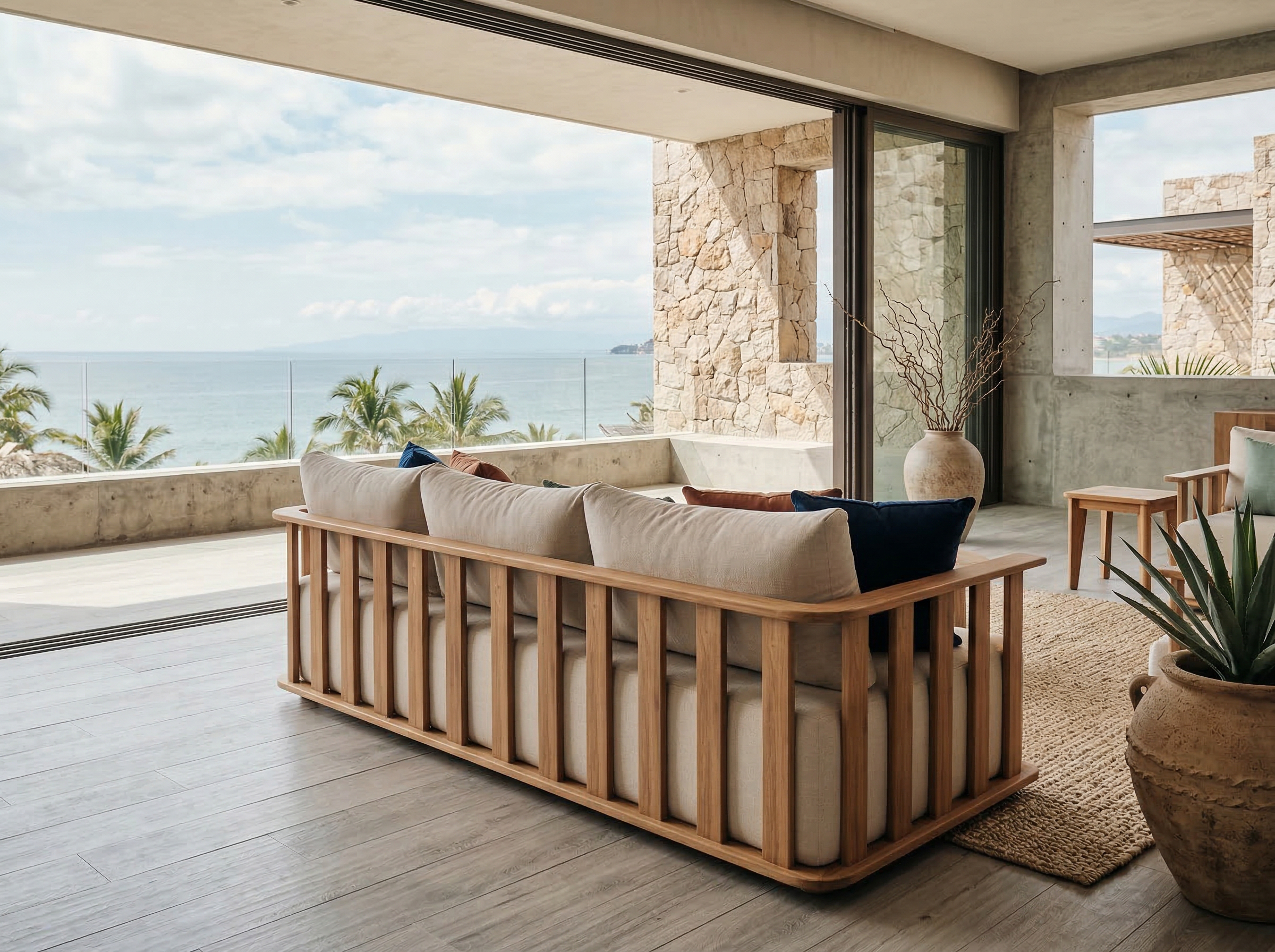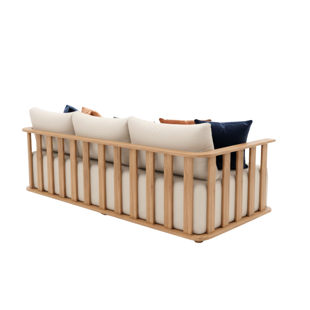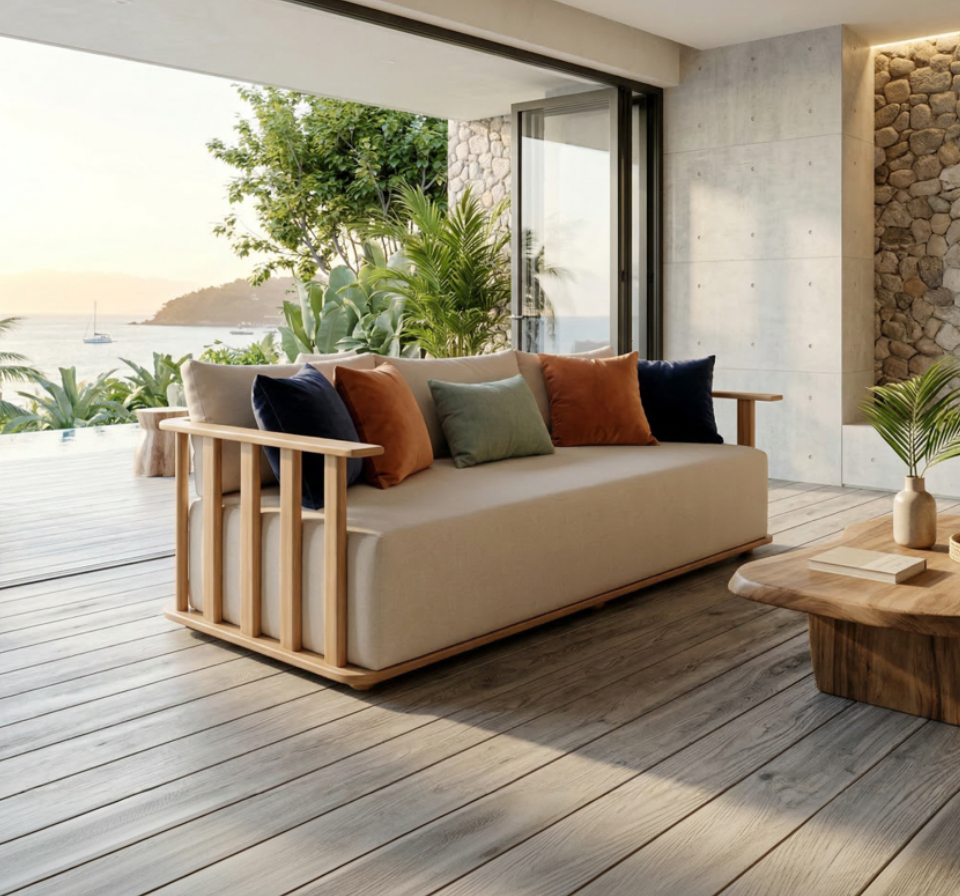 Madera de parota y cojines en tela sumbrella, hule espuma de alta densidad.