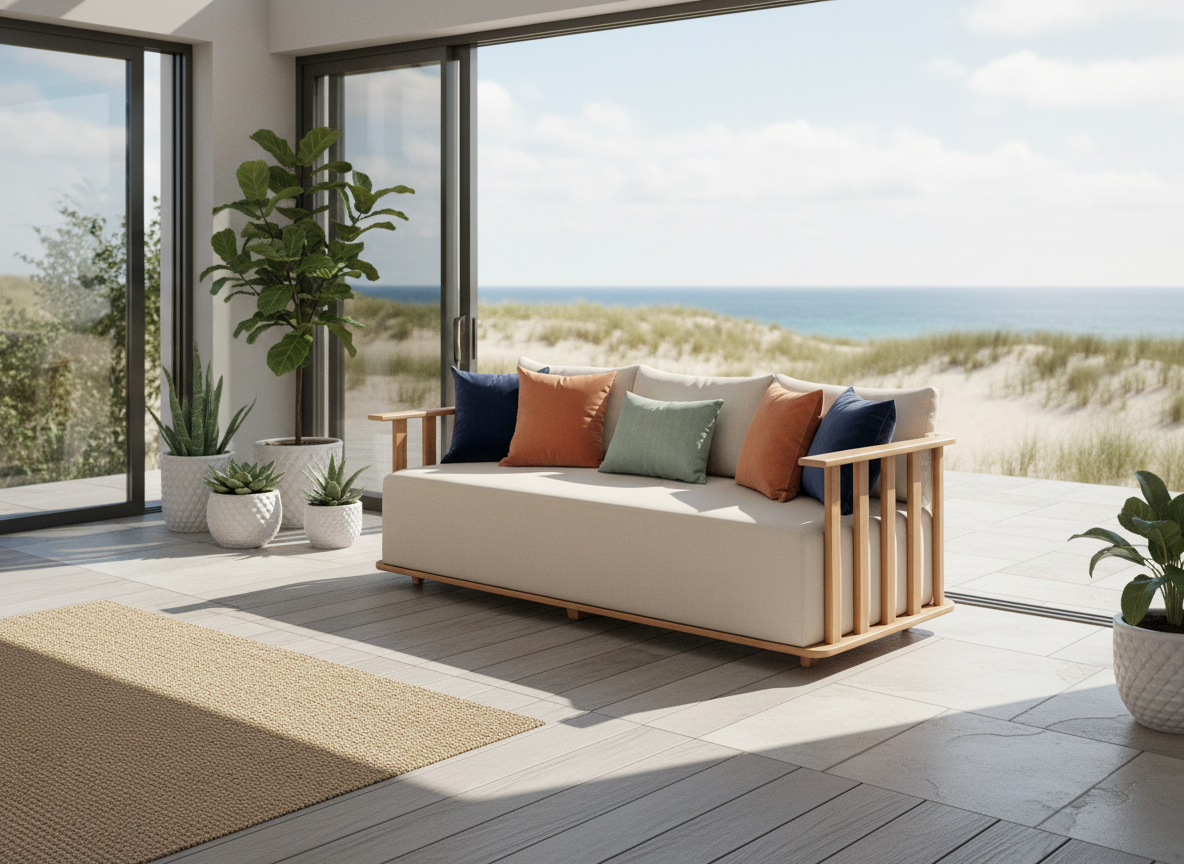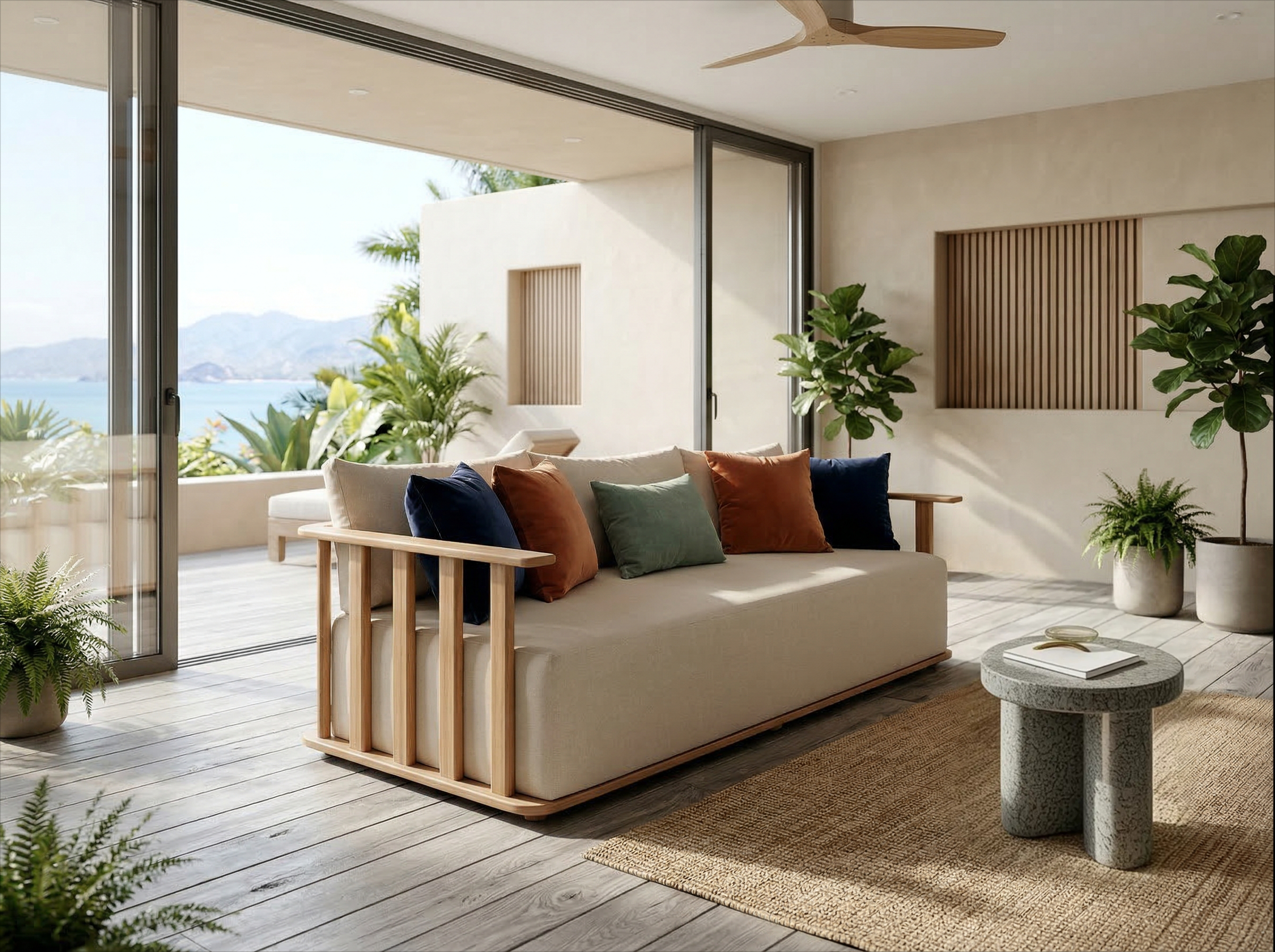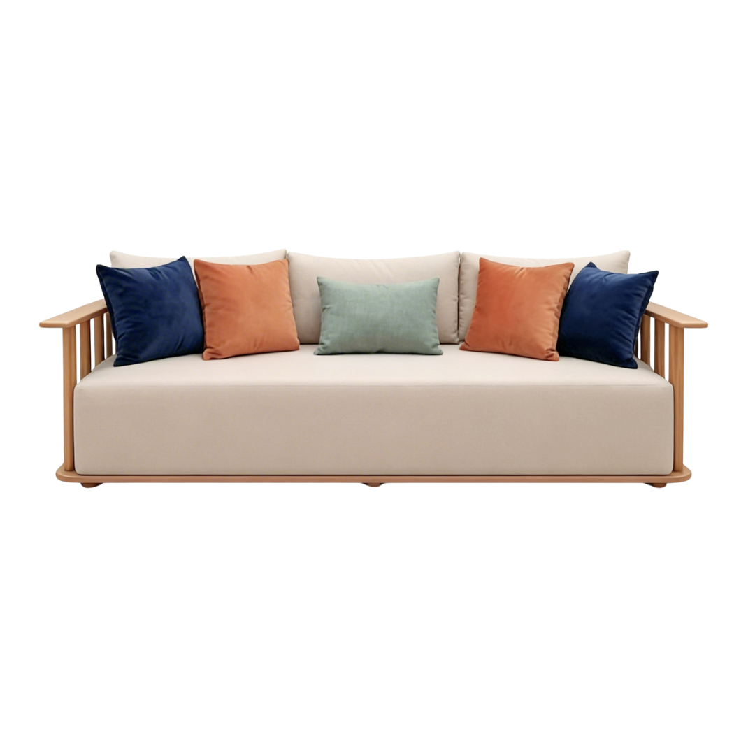 Madera de parota y cojines en tela sumbrella, hule espuma de alta densidad.