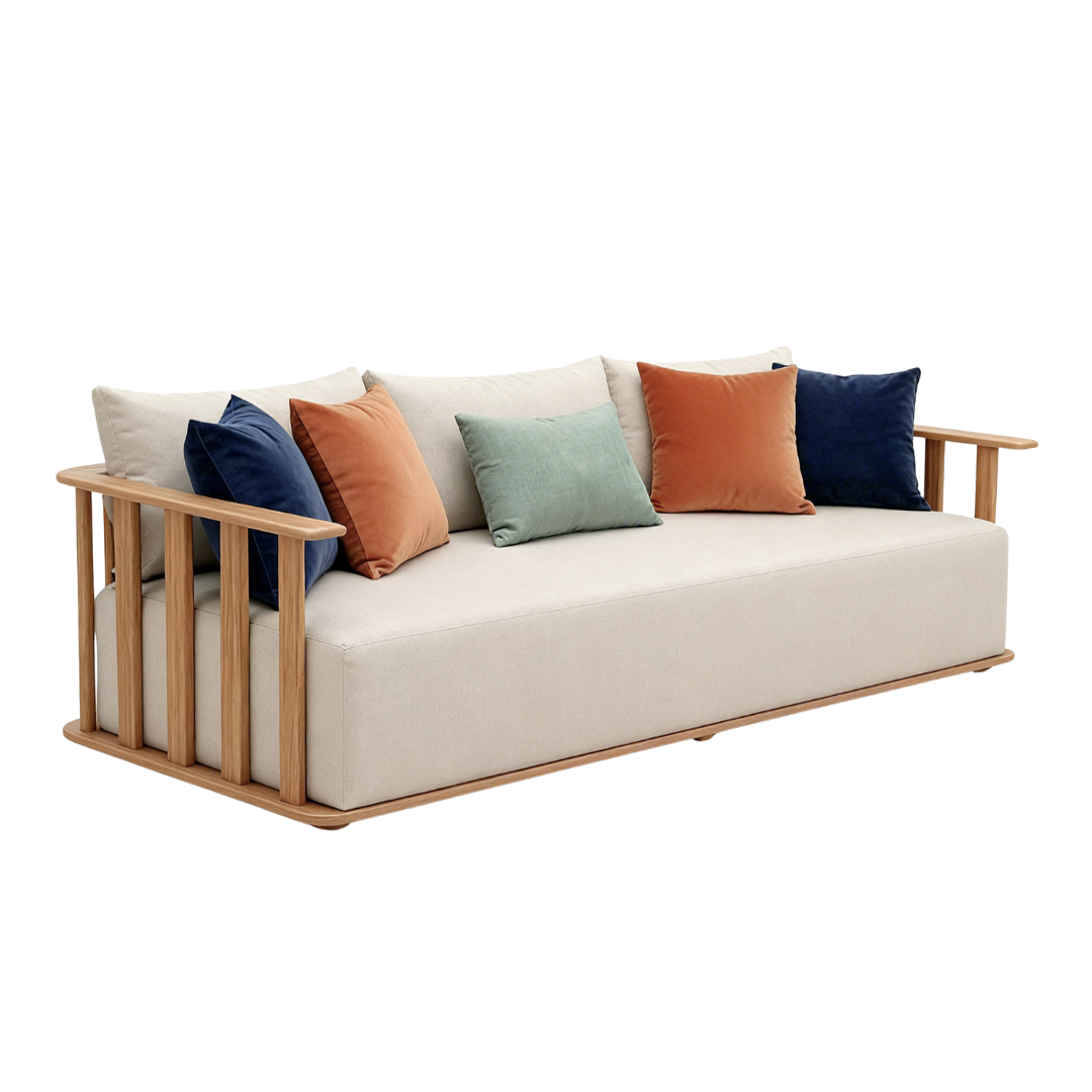 Materiales: Sillón fabricado con estructura de madera Rosa Morada, cojinería de asiento con espuma de alta densidad, funda doble, cierre reforzado y tela de tapicería a elección o personalizable.