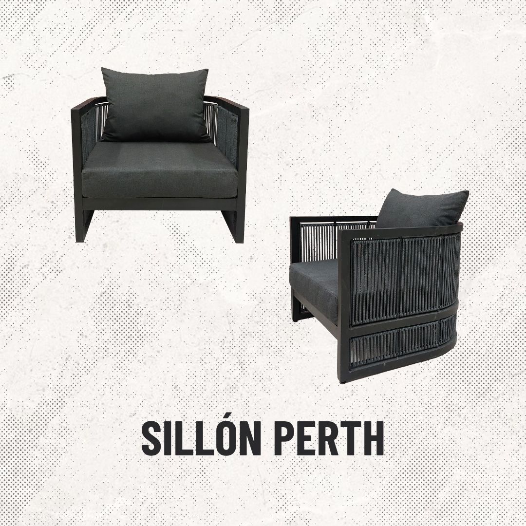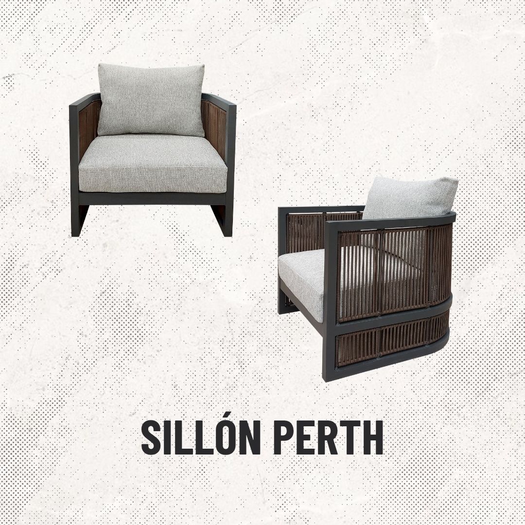 Sillón fabricado con estructura de madera, tejidas con rejilla sintética, cojinería fabricada con hule espuma de alta densidad y tela resistente al sol y la intemperie.