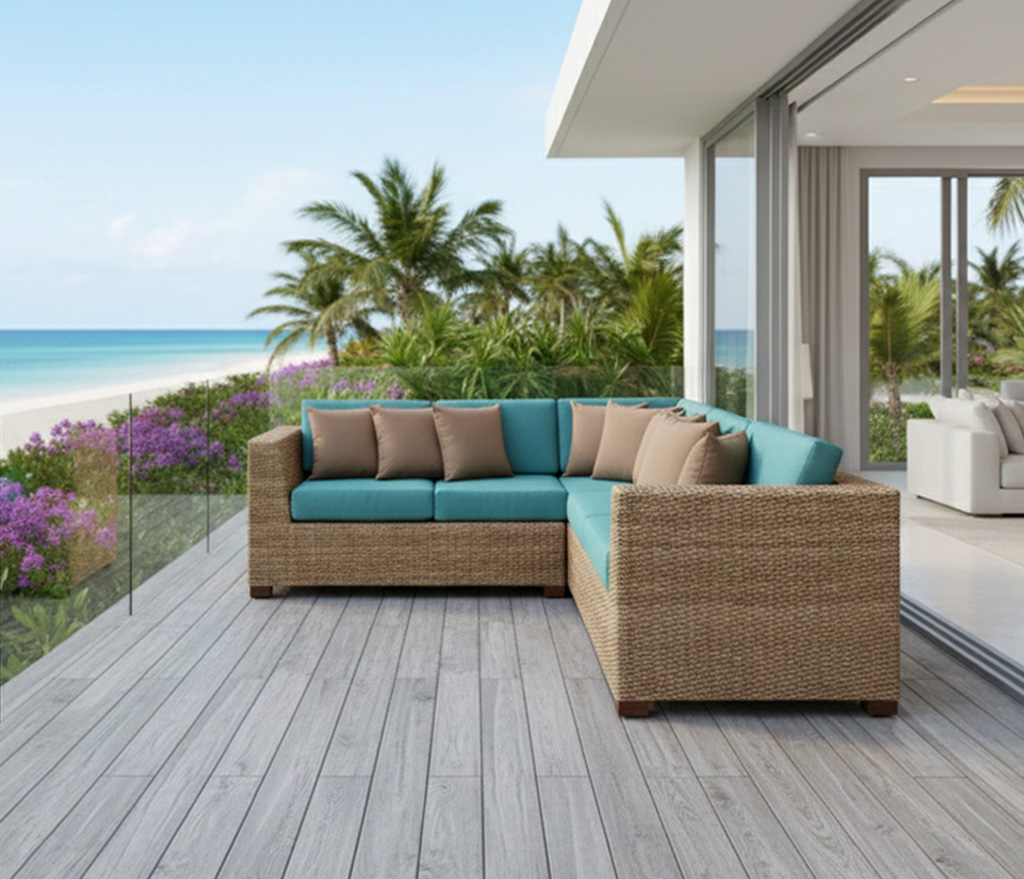 Estructura de aluminio tejida con rattan sintético, cojines en tela Sumbrella y mesa de centro con cubierta de cristal.