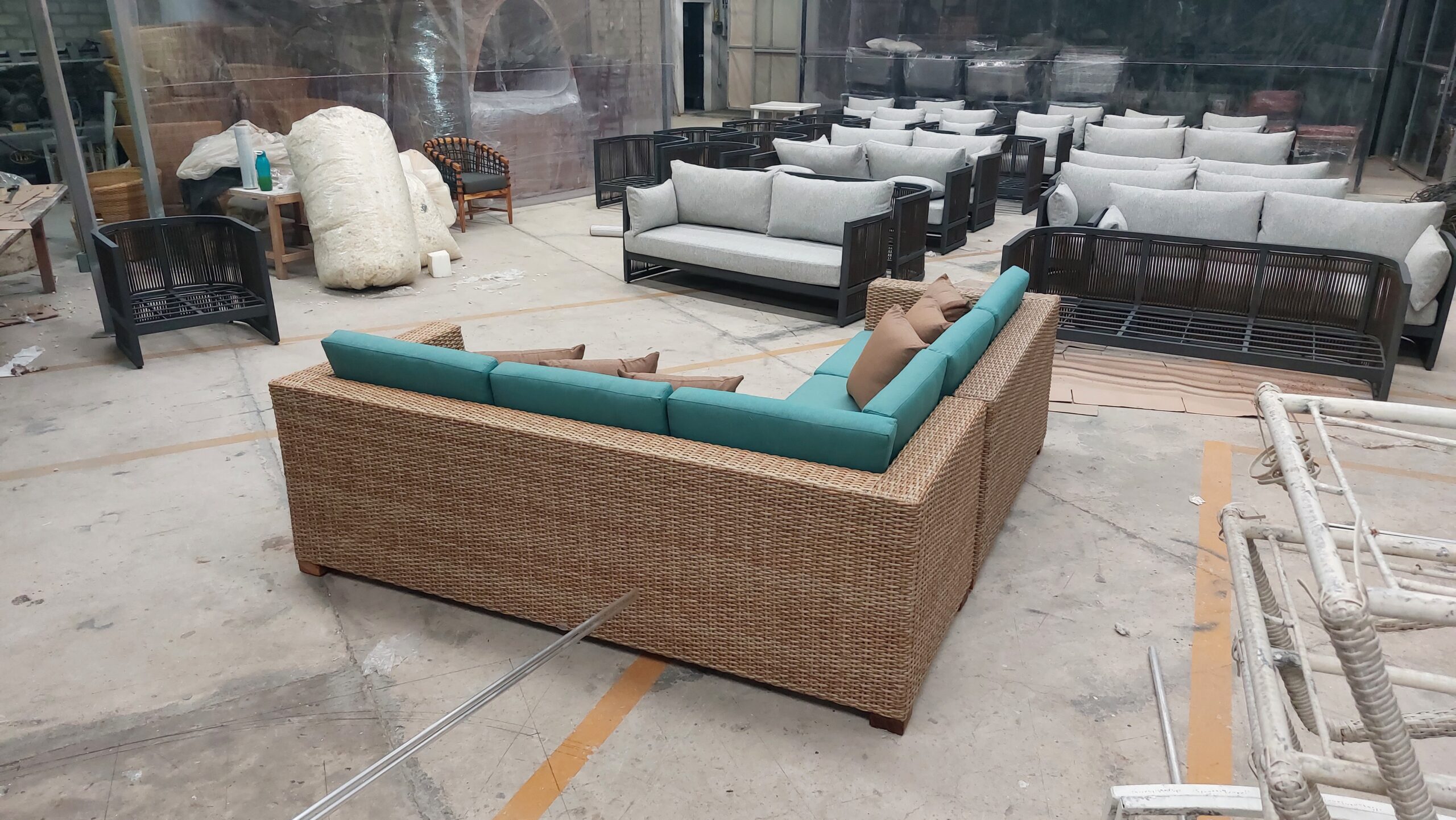 Armazón de aluminio, tejido con hilo, cojines en tela sumbrella, hule espuma de alta densidad.