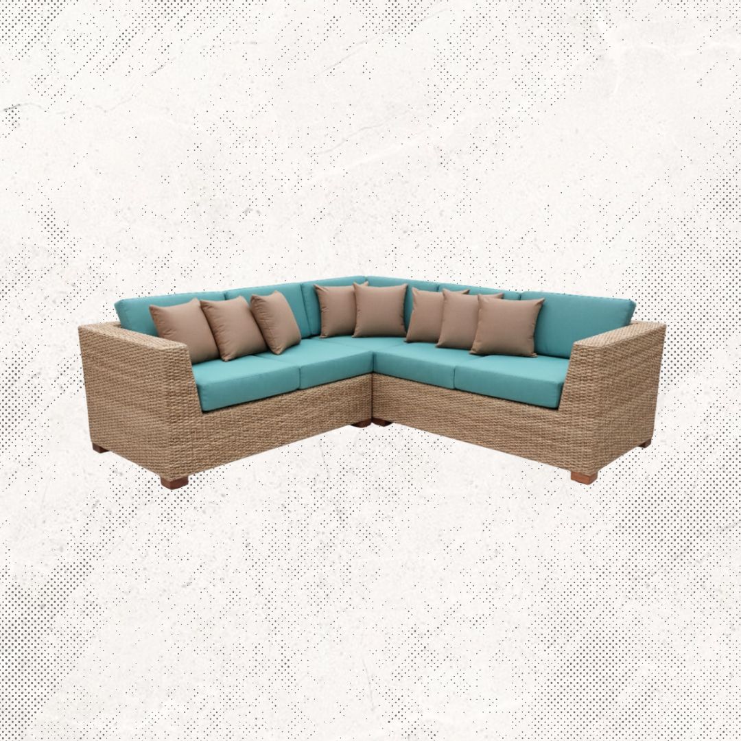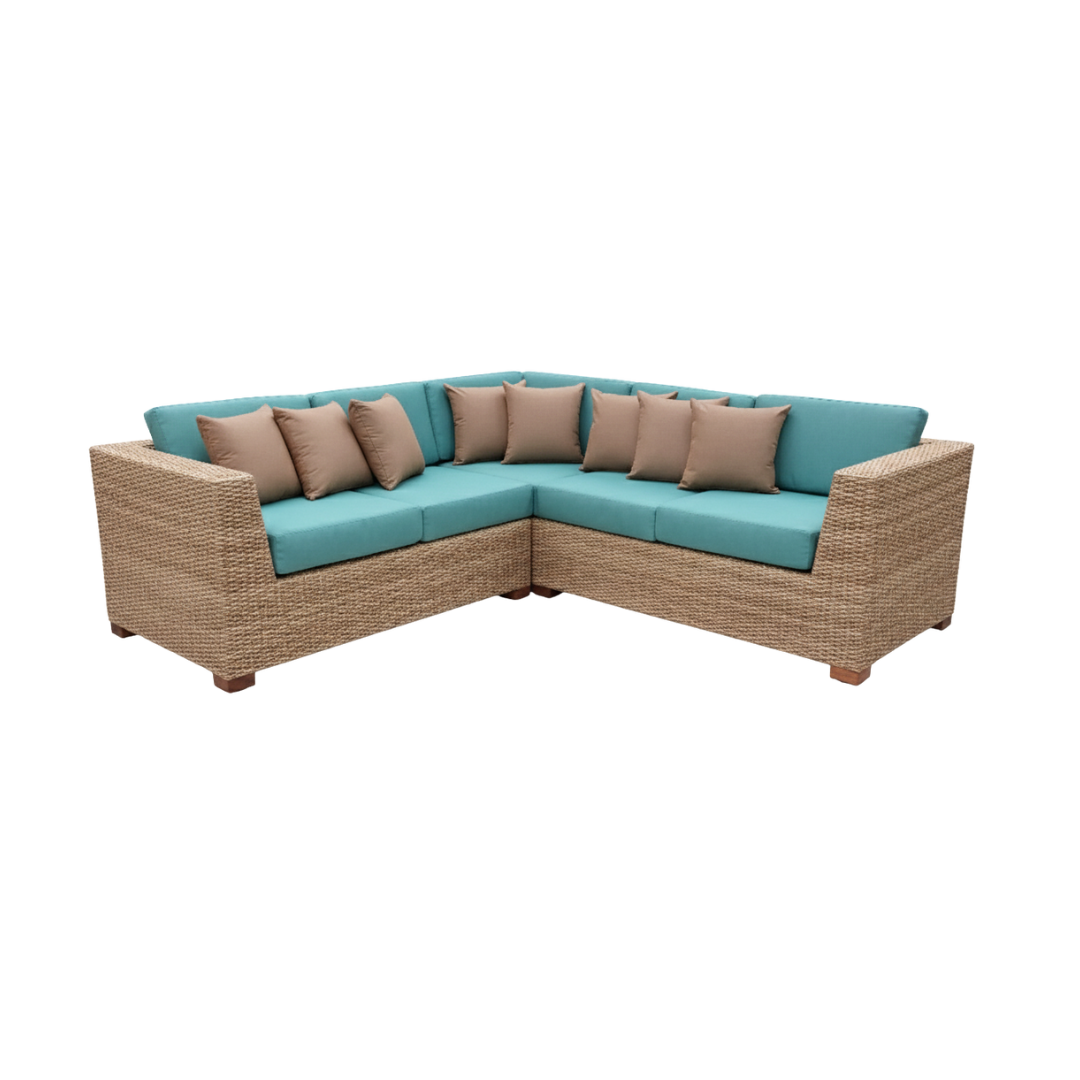 Materiales: Sofá con estructura de aluminio tejida con rejilla sintética de alta calidad, cojinería fabricada con hule espuma de alta densidad y tela resistente al sol y la intemperie.