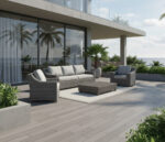 Materiales: Sala de 6 piezas modelo Casablanca (1 esquinero, 2 asientos con respaldo, 2 asientos planos con cojín, 1 mesa de centro) con estructura de aluminio tejida con rejilla sintética de alta calidad, cojinería fabricada con hule espuma de alta densidad y tela resistente al sol y la intemperie.