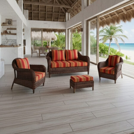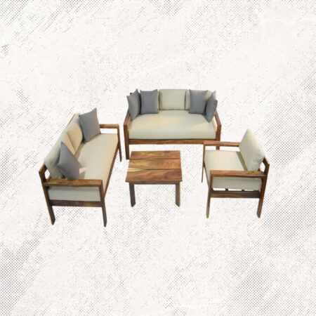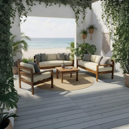 Materiales: Sala con estructura de madera, cojinería fabricada con hule espuma de alta densidad y tela resistente al sol y la intemperie.