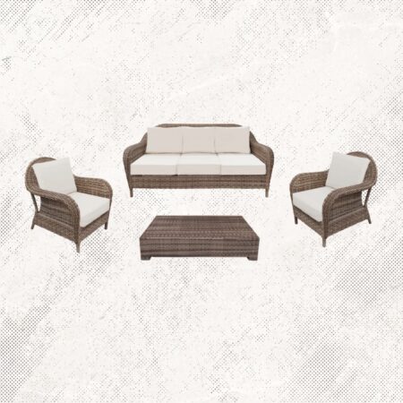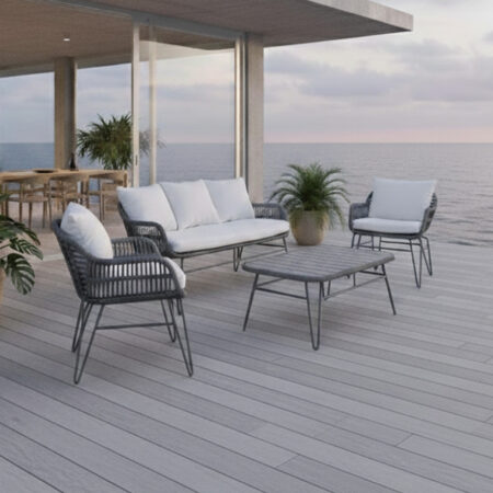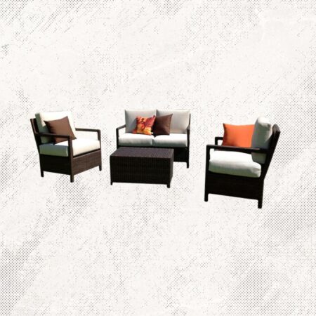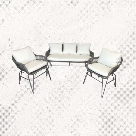 Materiales: Sala con estructura de aluminio, tejida con rejilla sintética de alta calidad, cojinería fabricada con hule espuma de alta densidad y tela resistente al sol y la intemperie.