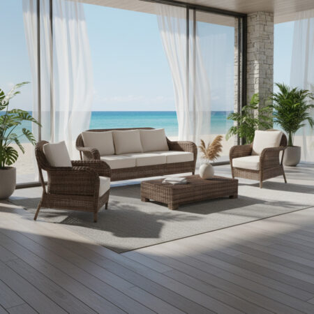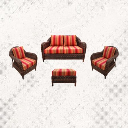 Materiales: Sofá con estructura de madera, tejida con rejilla sintética de alta calidad, cojinería fabricada con hule espuma de alta densidad y tela resistente al sol y la intemperie.