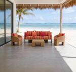 Materiales: Sala con estructura de madera, cojinería fabricada con hule espuma de alta densidad y tela resistente al sol y la intemperie.