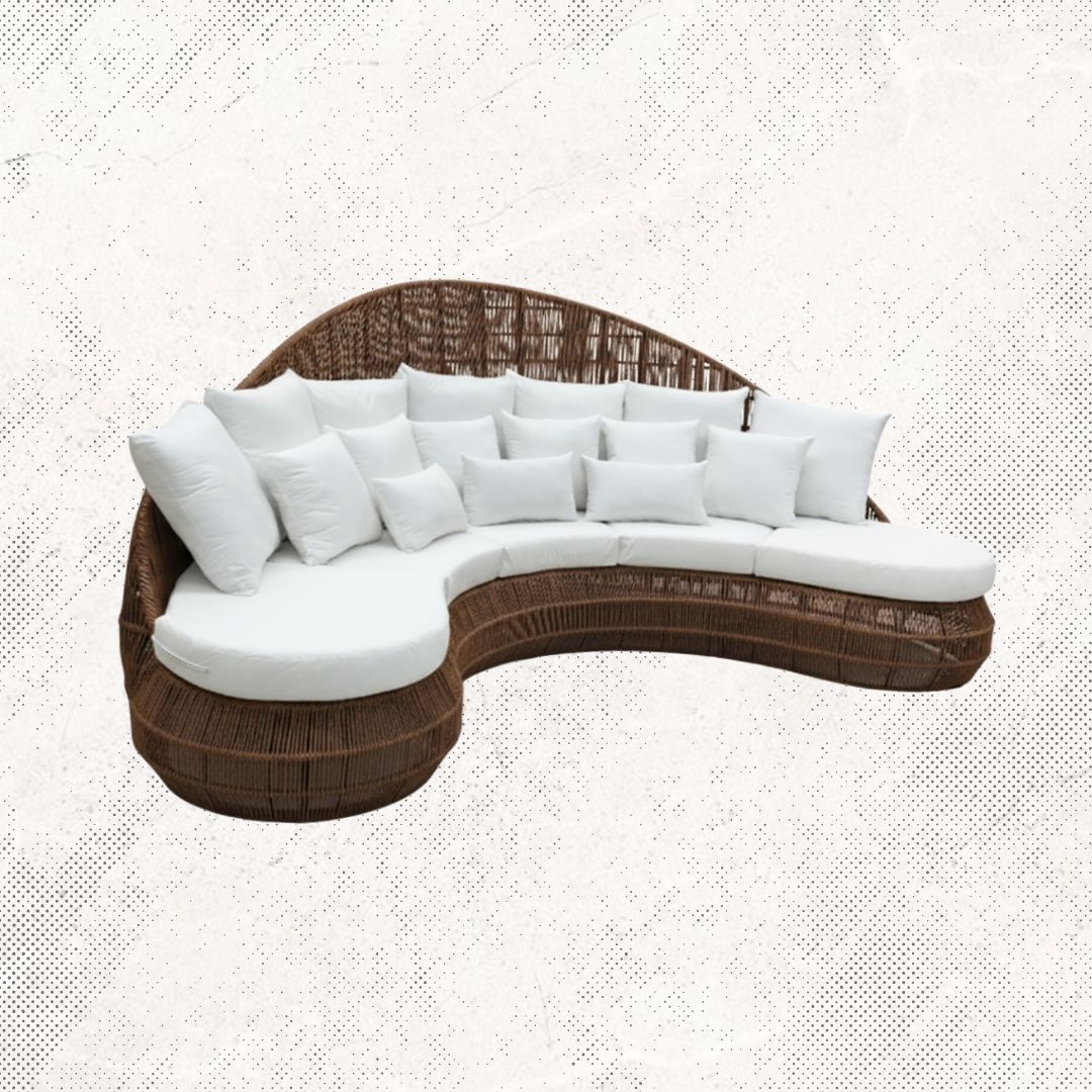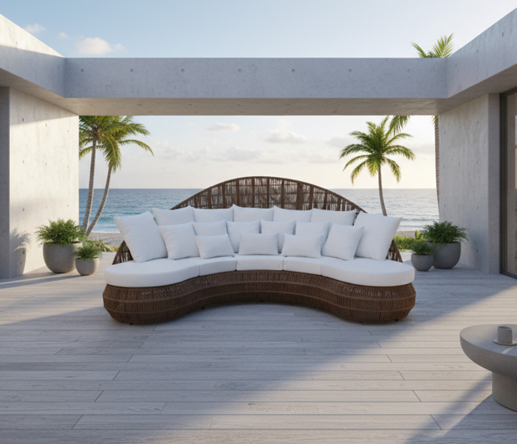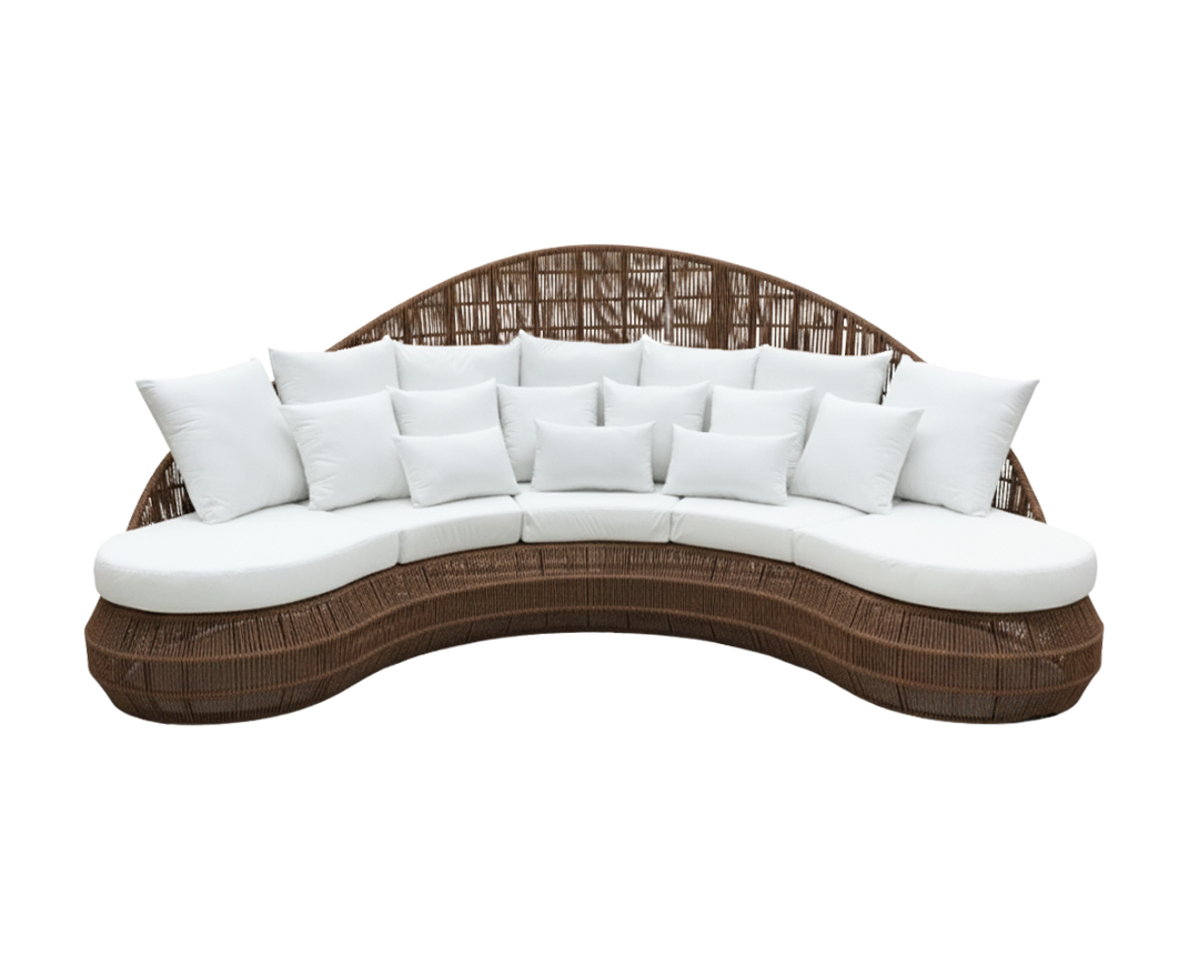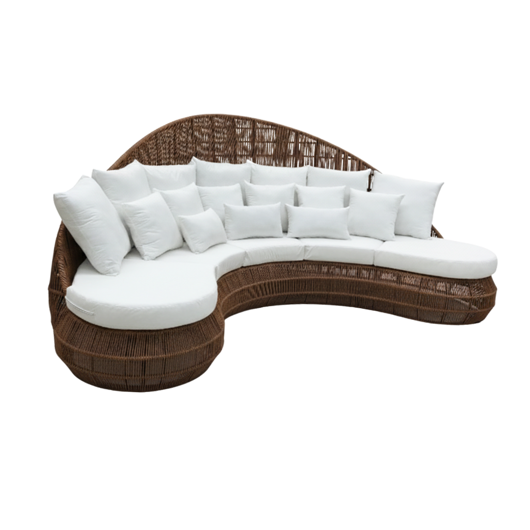 Materiales: Sofá con estructura de aluminio tejida con rejilla sintética de alta calidad, cojinería fabricada con hule espuma de alta densidad y tela resistente al sol y la intemperie.