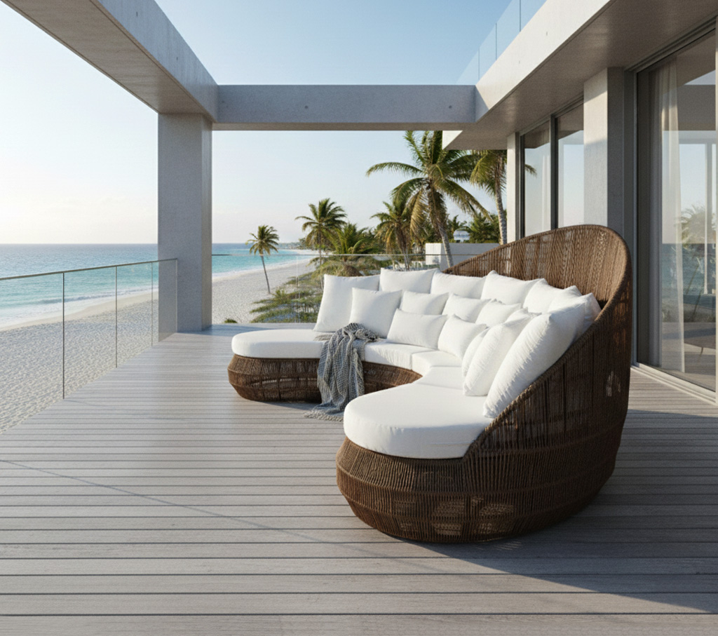 Estructura de aluminio tejida con rattan sintético, cojines en tela Sumbrella y mesa de centro con cubierta de cristal.