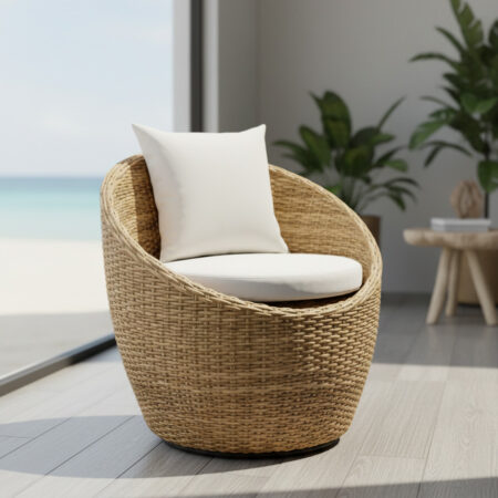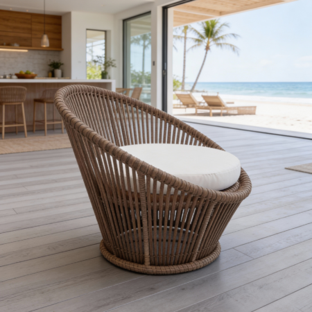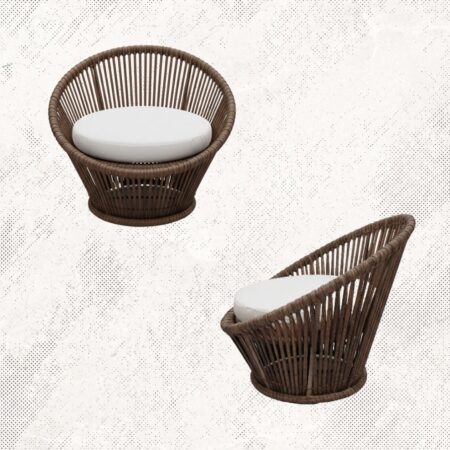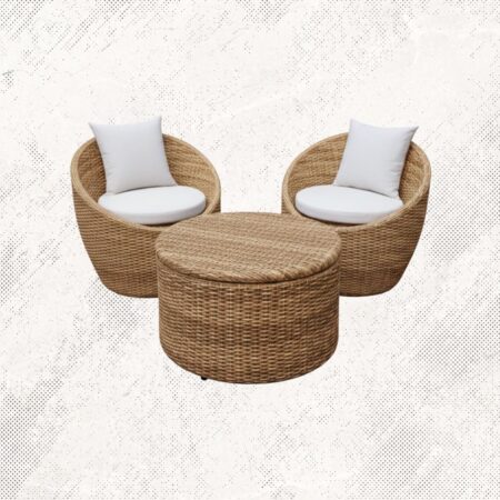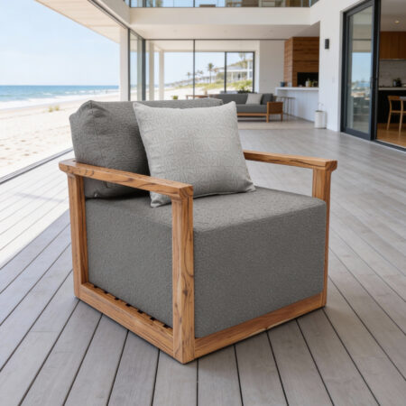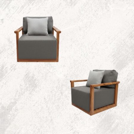 Materiales: Sillones con estructura de aluminio, tejidos con rejilla sintética de alta calidad, cojinería fabricada con hule espuma de alta densidad y tela resistente al sol y la intemperie.